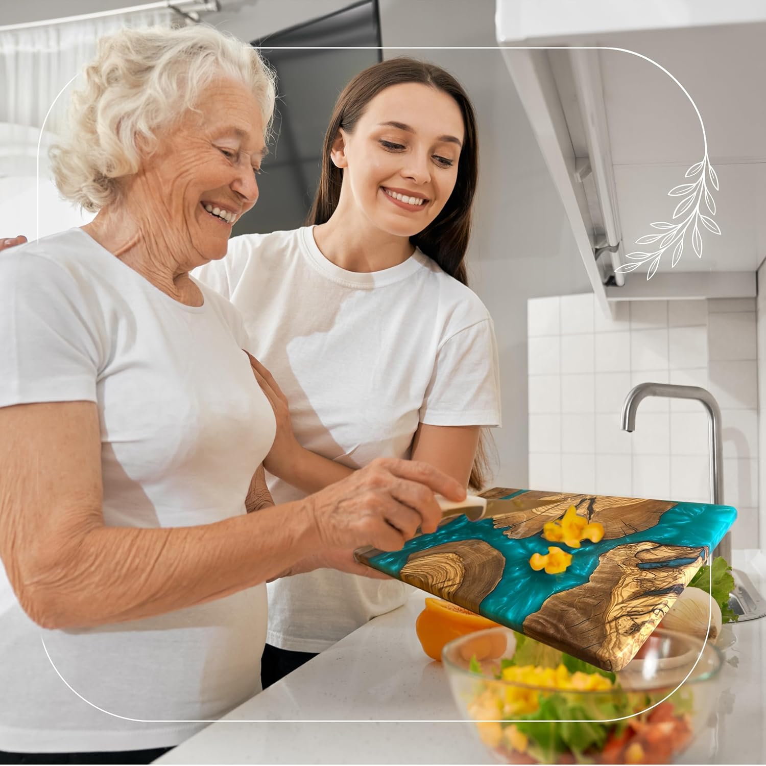 Beautifully Designed Unique And Durable: Our rustic live edge wood cutting board for kitchen have its own uniquely stunning olive wood grain. Dimensions, colors, shapes and wood grain patterns of natural resin cheese boards charcuterie boards may slightly vary due to the distinctive properties of each olive tree. Our sturdy and practical nice wood cheese board beach can be used as charcuterie kitchen accessories, served as a unique cutting boards for kitchen decor.