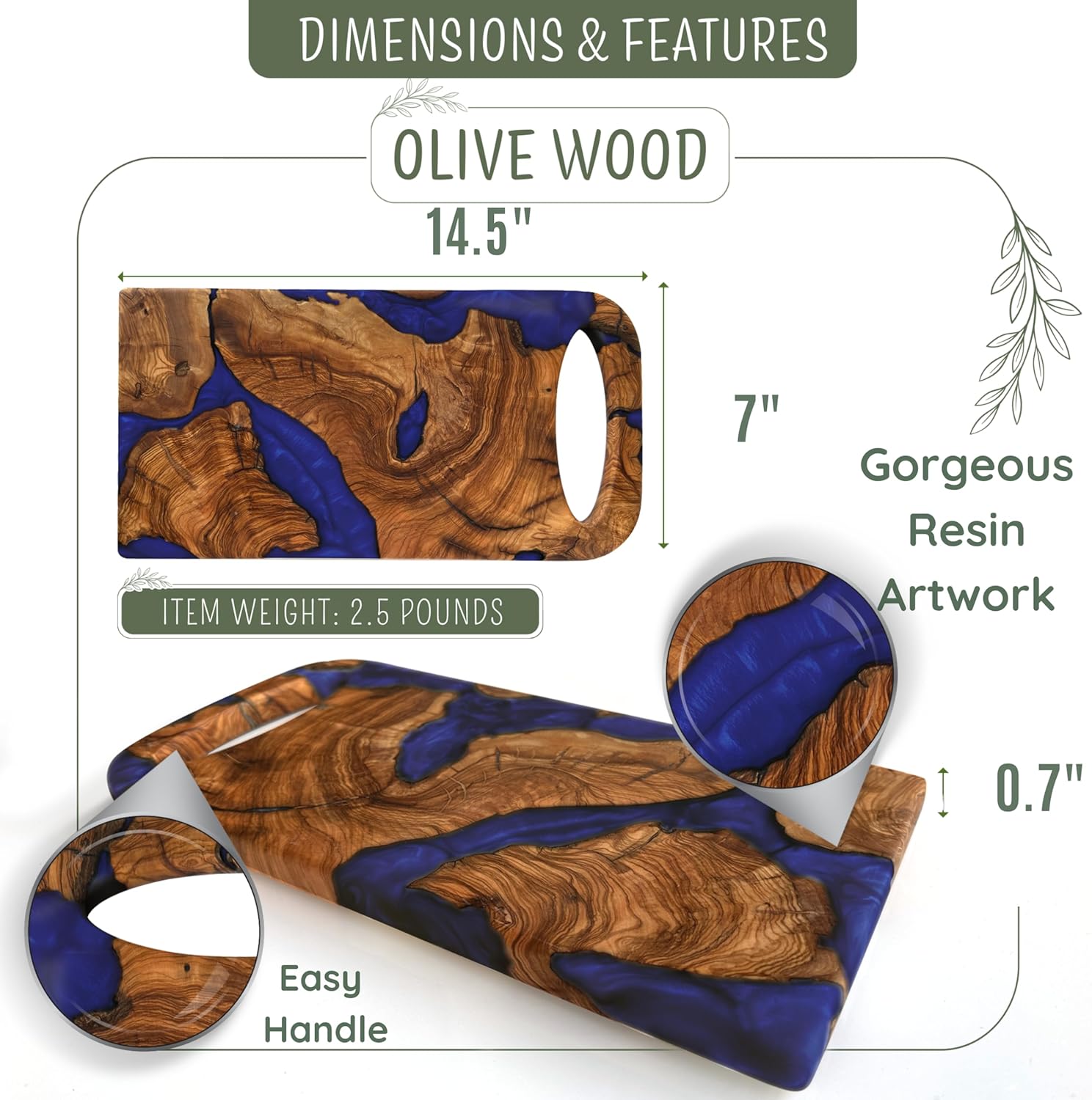 Handcrafted boldly grained, sustainably sourced olivewood cheese platter accented with food grade resin epoxy. Each organically shaped, handcrafted charcuterie resin olive wood small cutting boards for kitchen boards exhibit unique characteristics and created with care, expertise and passion.