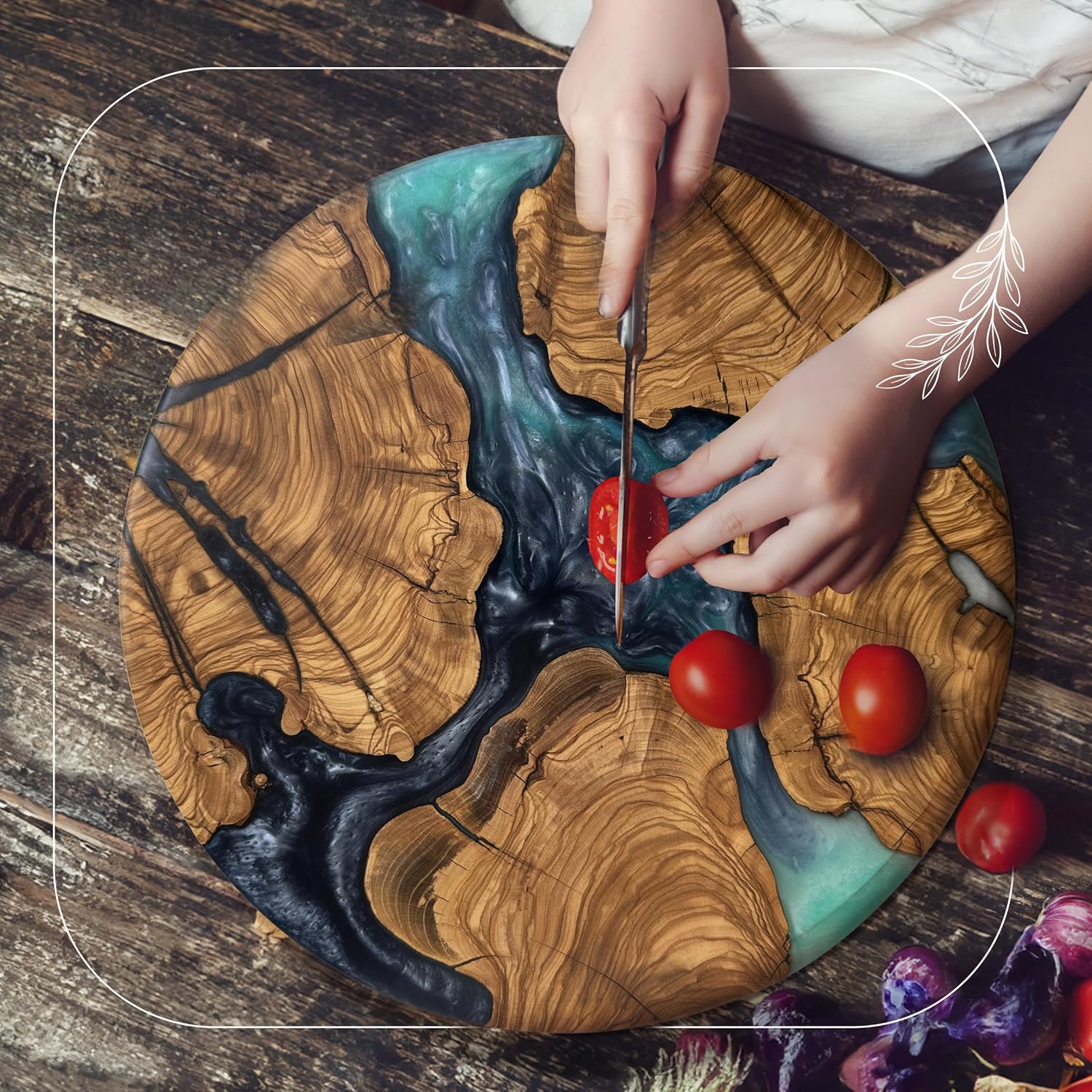 HANDCRAFTED OLIVE WOOD CUTTING BOARD: Decorative wooden large round charcuterie board and wooden pizza serving tray has been carefully handcrafted from natural olive wood board for charcuterie. Our art resin round cutting boards for kitchen are offered in an artisan-inspired rustic shape. Handmade cutting boards wood products are easy to care for as resin round trays home decor. This circular cutting board wood resin for cheese and wine has a dense grain and can last not only for your lifetime but for generations.