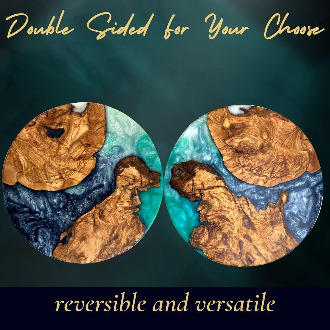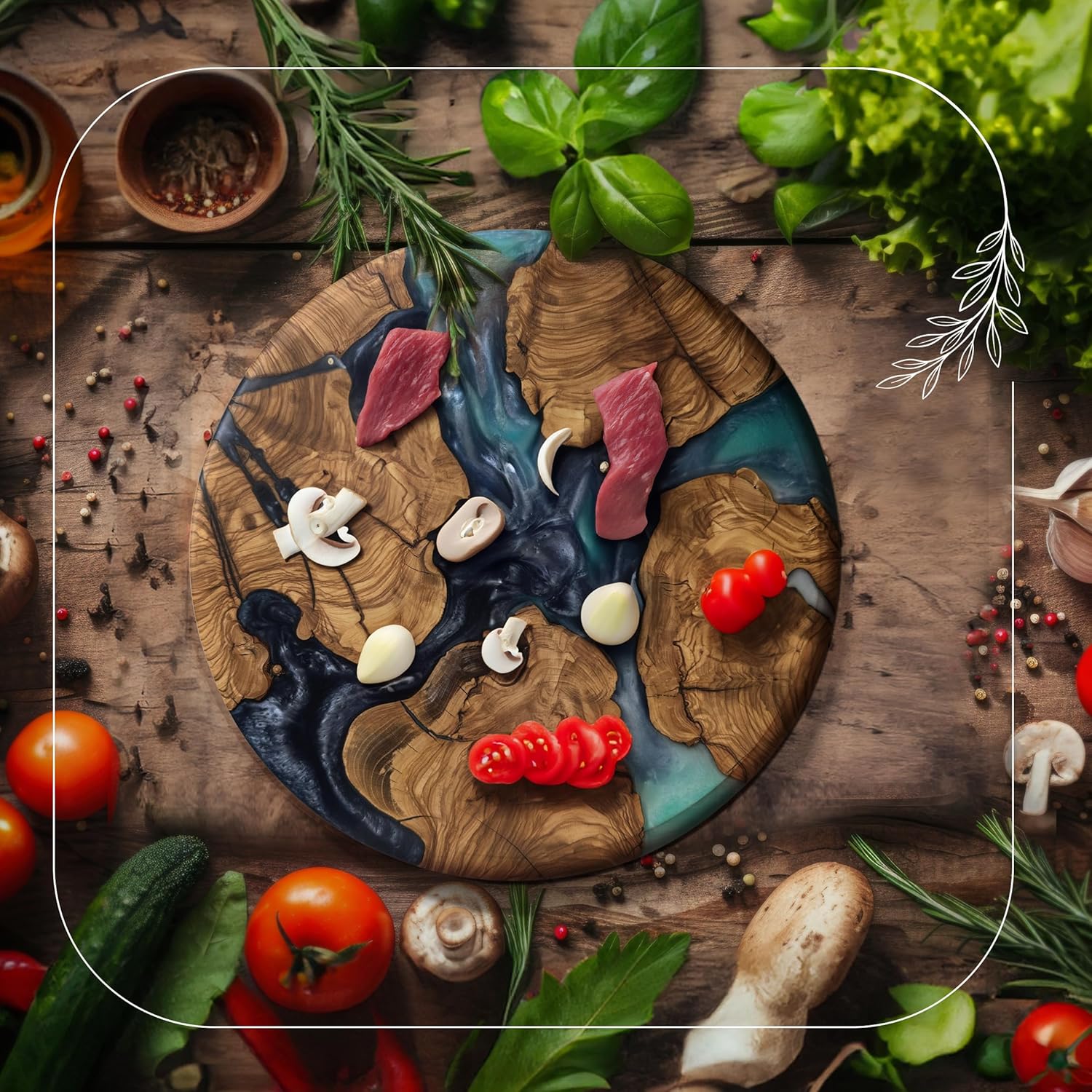 HANDCRAFTED OLIVE WOOD CUTTING BOARD: Decorative wooden large round charcuterie board and wooden pizza serving tray has been carefully handcrafted from natural olive wood board for charcuterie. Our art resin round cutting boards for kitchen are offered in an artisan-inspired rustic shape. Handmade cutting boards wood products are easy to care for as resin round trays home decor. This circular cutting board wood resin for cheese and wine has a dense grain and can last not only for your lifetime but for generations.
