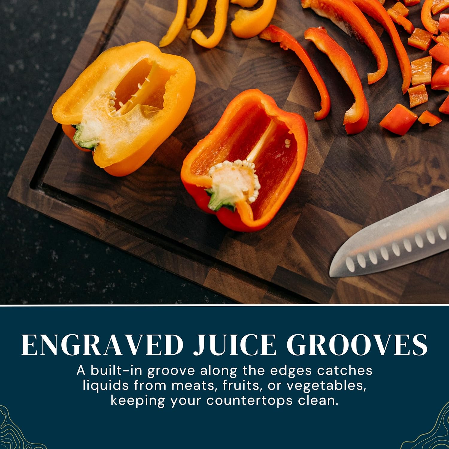 A wide, deep groove collects excess liquids from meats, fruits, and vegetables, keeping your countertops clean and dry.