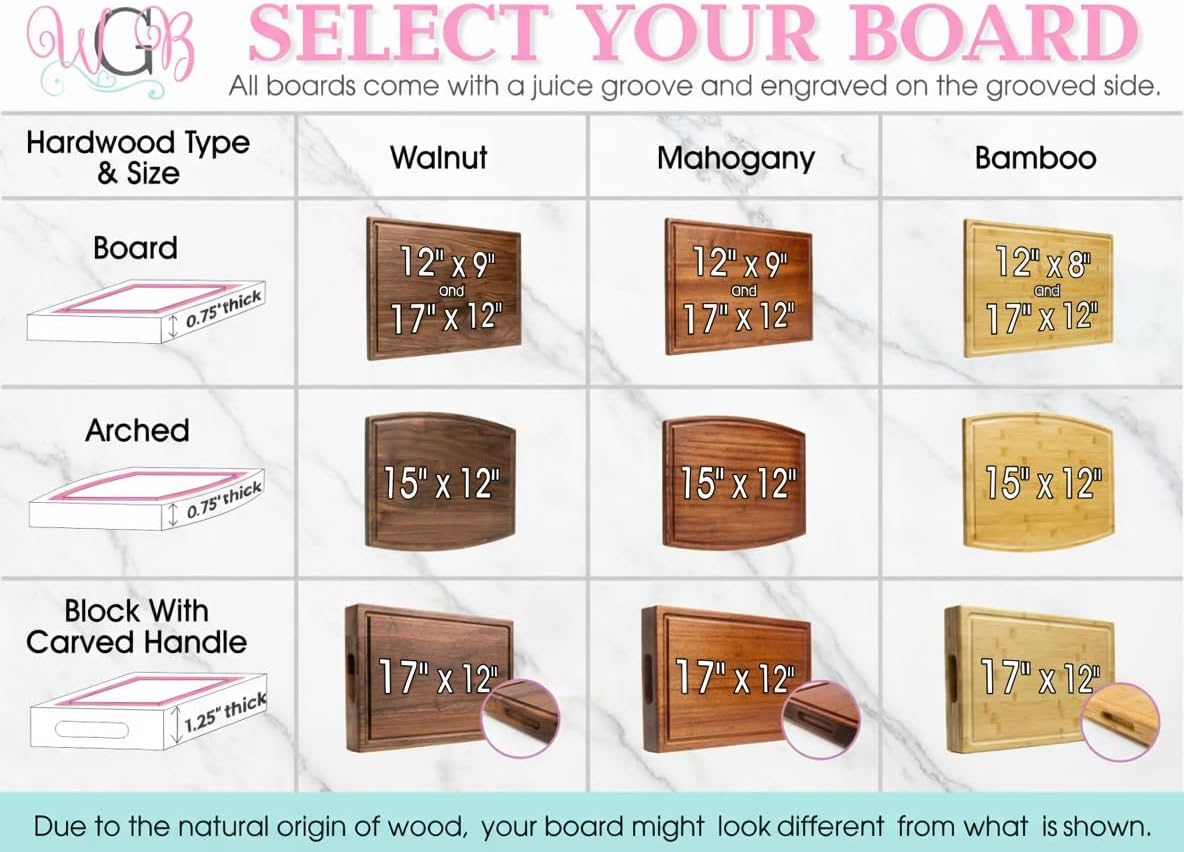 ❤️ Made With Love: Our customizable boards from Wedding Gift Boutique come in various sizes and wood colors. They are produced by a small, family-owned business, renowned for their quality and style, distinguishing them from other custom cutting boards.