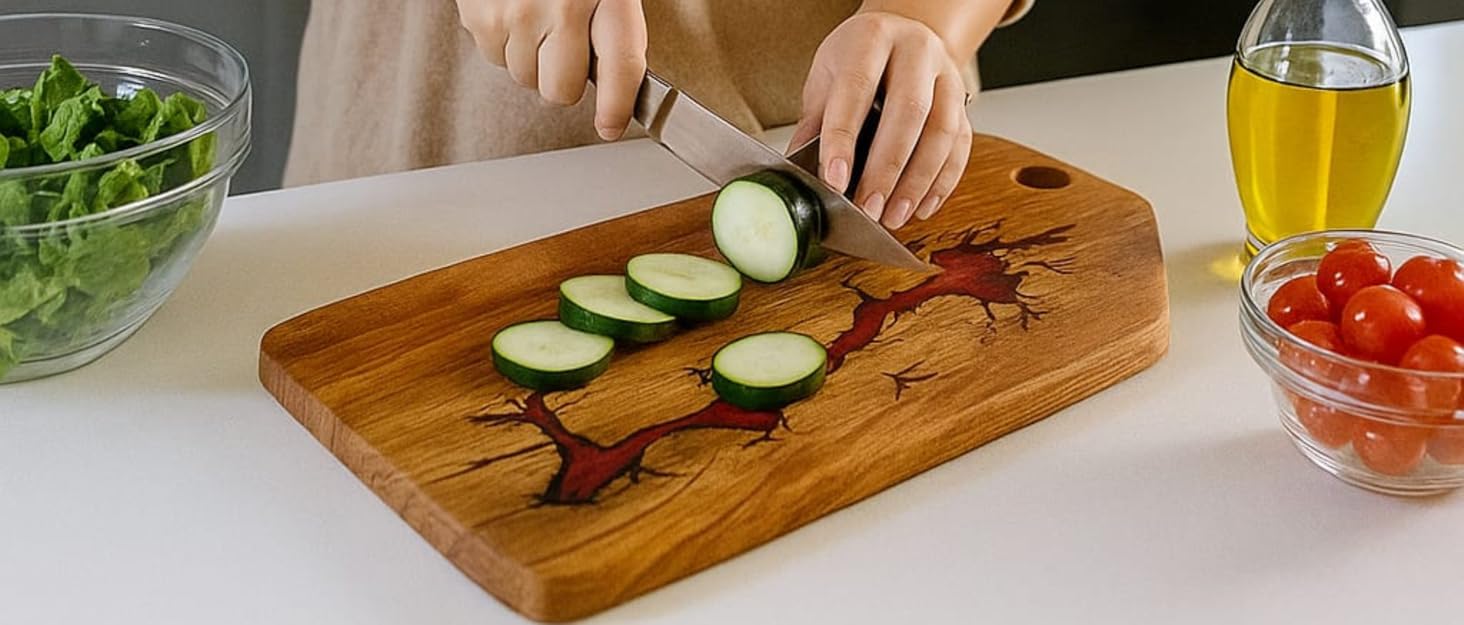 Each hand-poured resin board celebrates nature’s imperfections, uniting art with functionality in your kitchen.