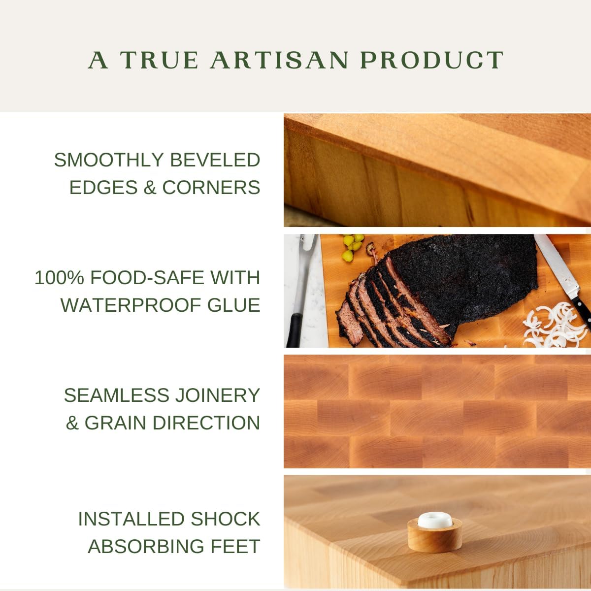 SAFE AND EASY TO HANDLE: The Boardsmith end grain cutting board has smoothly beveled edges and corners that are easy to handle and maintain. Handcrafted with careful attention to wood grain direction and seamless joinery, the board uses high-quality food-safe and waterproof glue that is 100% food-safe. Handmade wooden feet come installed on the board.