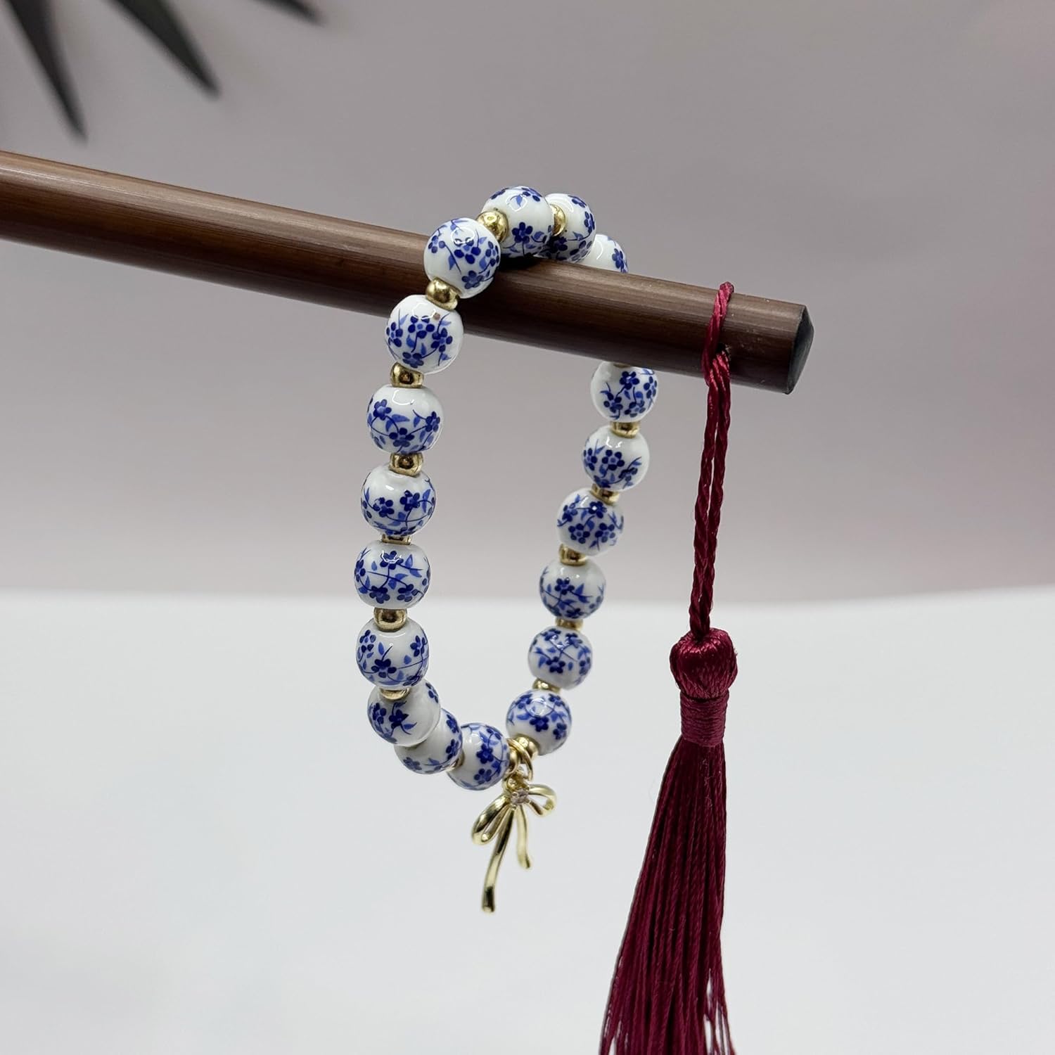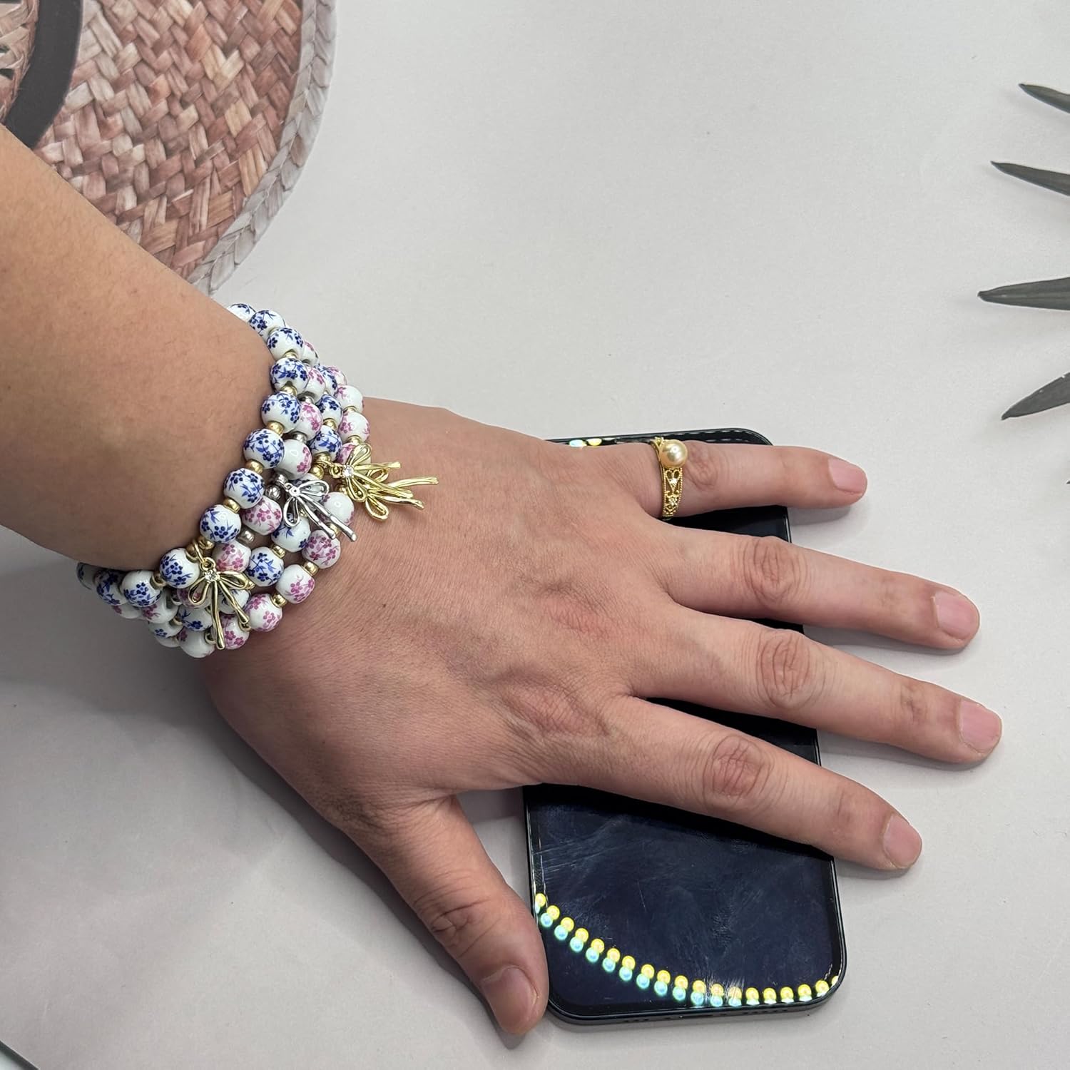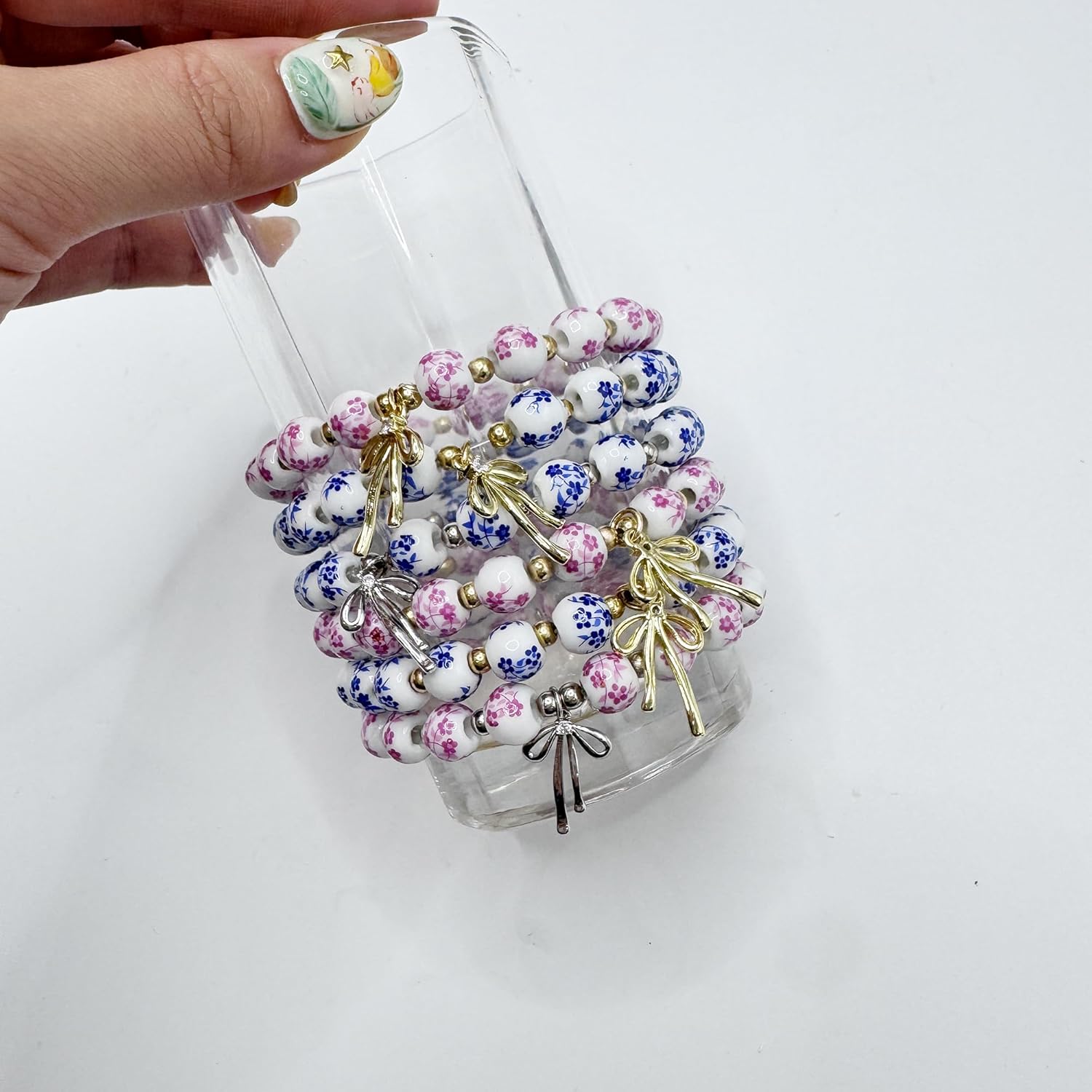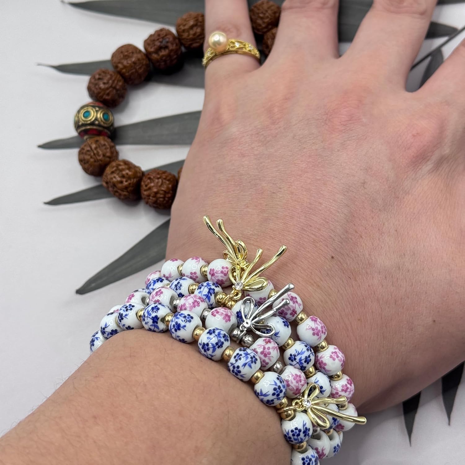 This exquisite handmade beaded bracelet seamlessly combines elegance and charm. Each 8mm painted flower porcelain bead is made of high-quality materials and exquisite craftsmanship, ensuring that the glaze color does not fade over the years when worn. The 18K gold-plated bow and 14K gold-plated gasket are all strung on a sturdy double elastic rope, embodying eternal beauty and a modern touch. When you raise your wrist, the light penetrates the edges of the crystal, casting the shadow of a butterfly flapping its wings on the ground – this is a secret romance unique to the wearer, a true luxury that elevates the ordinary daily life into an artistic moment. Tip: If you notice that the plated metal base beads has darkened, toothpaste can restore them to shine like new.