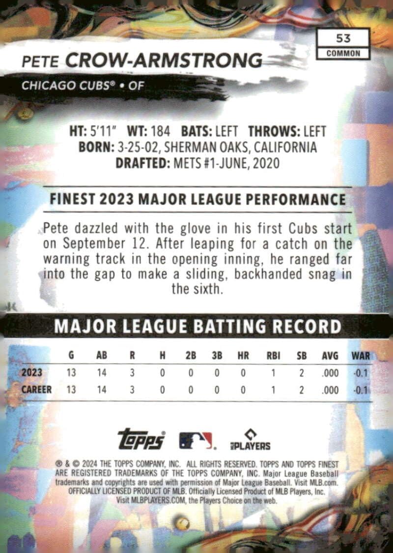 2024 Topps Finest #53 Pete Crow-Armstrong RC Rookie Chicago Cubs MLB Baseball Base Trading Card