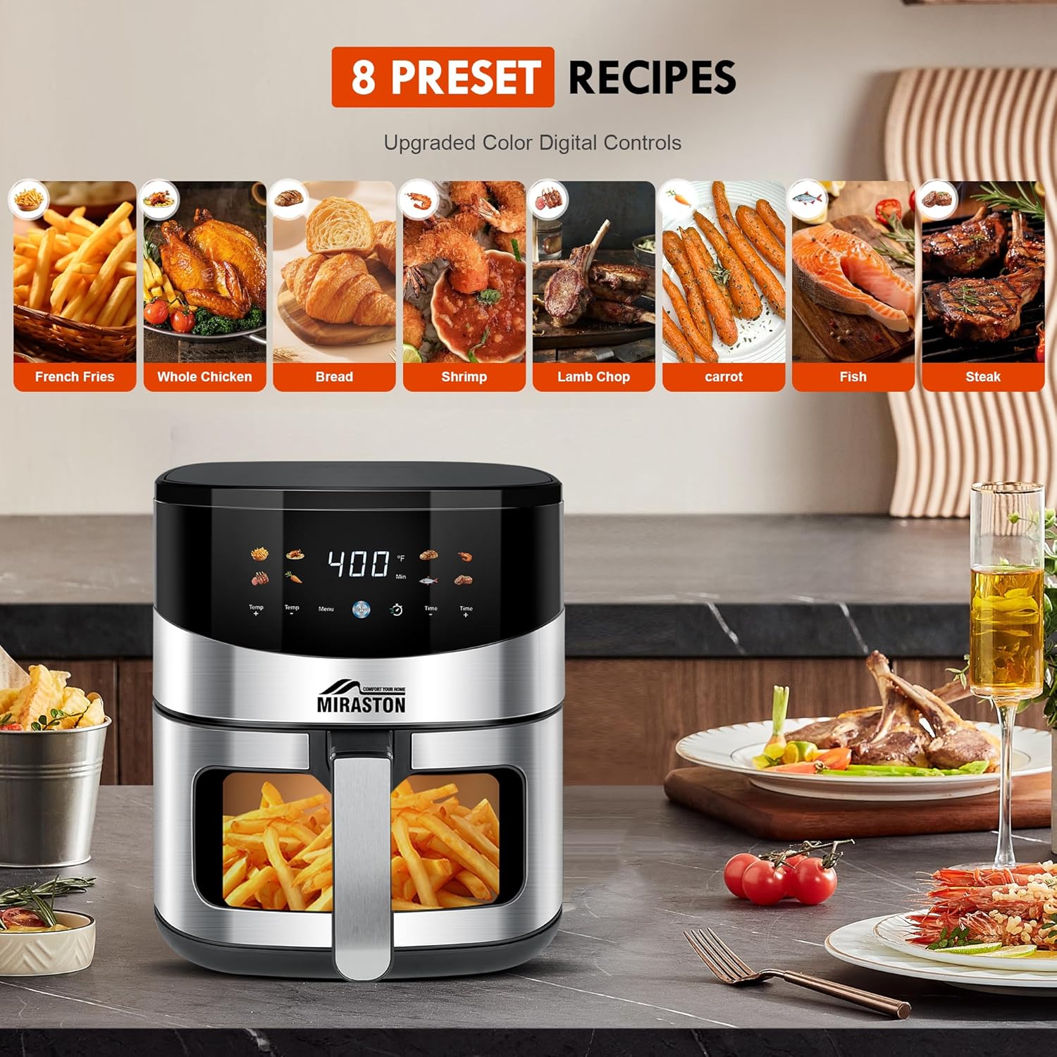 【Digital Touch Screen with 8 Presets】Effortlessly cook a variety of delicious foods like fries, wings, steak, fish, shrimp, vegetables, toast, and more with just a tap! The intuitive touch screen features 8 preset recipes, perfect for beginners, while advanced adjustable time (0-60 minutes) and temperature settings (180℉-400℉ in 5-degree increments) let you customize your own recipes and experiment with different cooking methods.