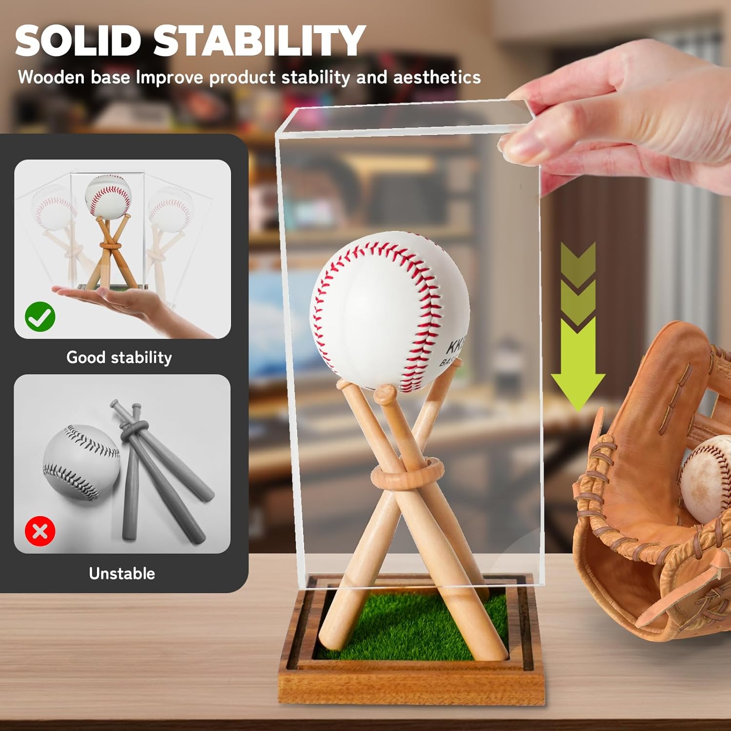 Upgraded Design: Features a stable wooden base that addresses the common issue of baseball stands tipping over; this design ensures that your baseball is securely displayed without the risk of falling, making it suitable for collectors and coaches alike