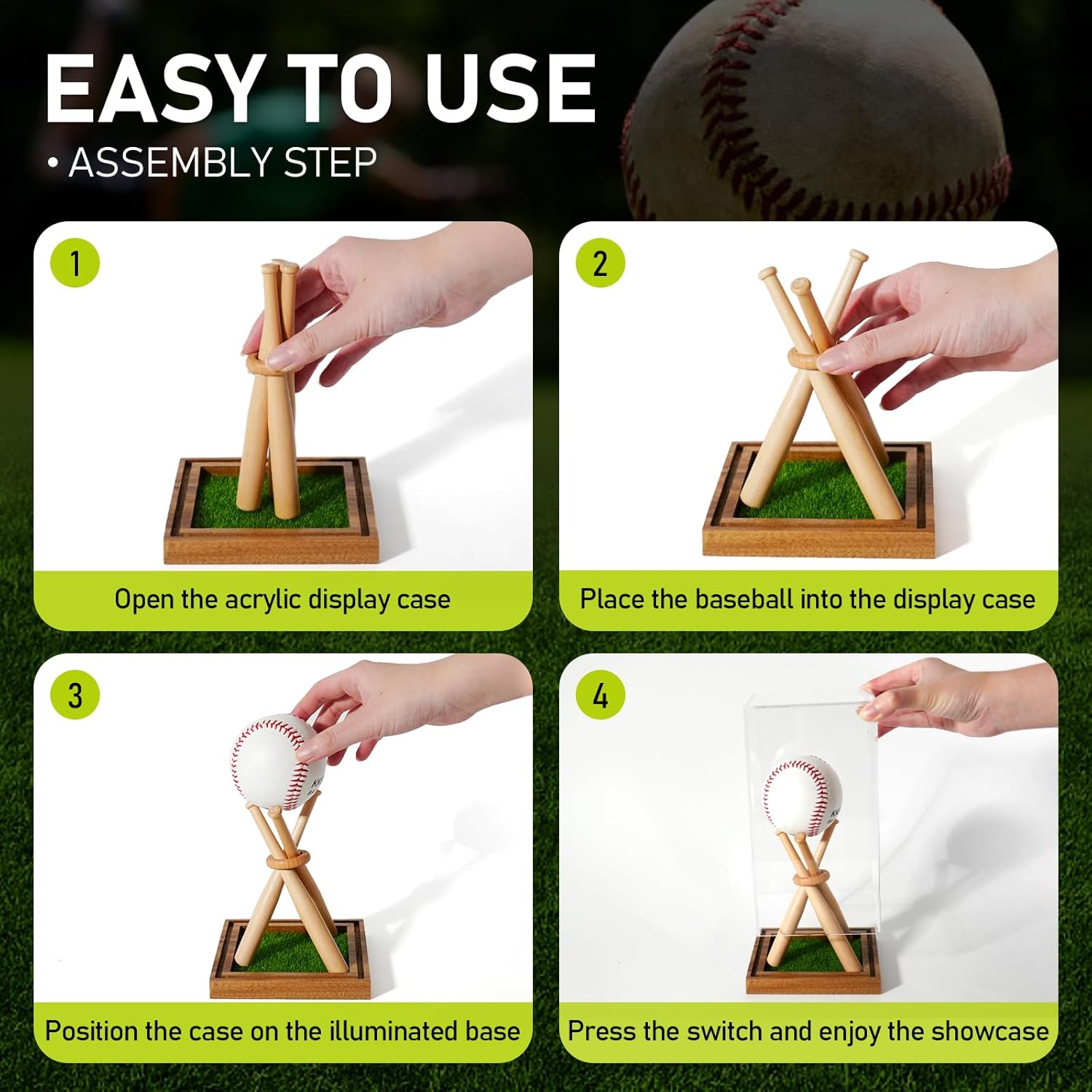 Complete Package: Includes a wooden base, a synthetic grass mat, a clear acrylic cover, three baseball holders, and a ring for adjustable display options; this combination creates an excellent display case for baseballs and other memorabilia like trophies and signed balls