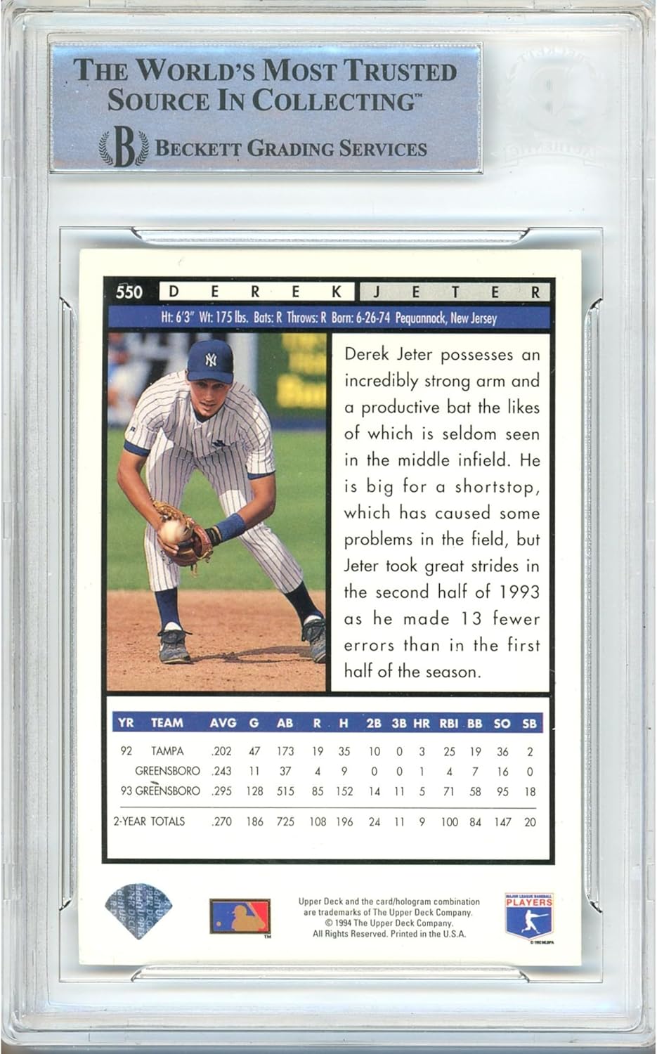 Authentic Autograph: This is a Derek Jeter signed baseball card from 1994 Upper Deck #550, encapsulated in a Beckett Authentic Auto Slab.