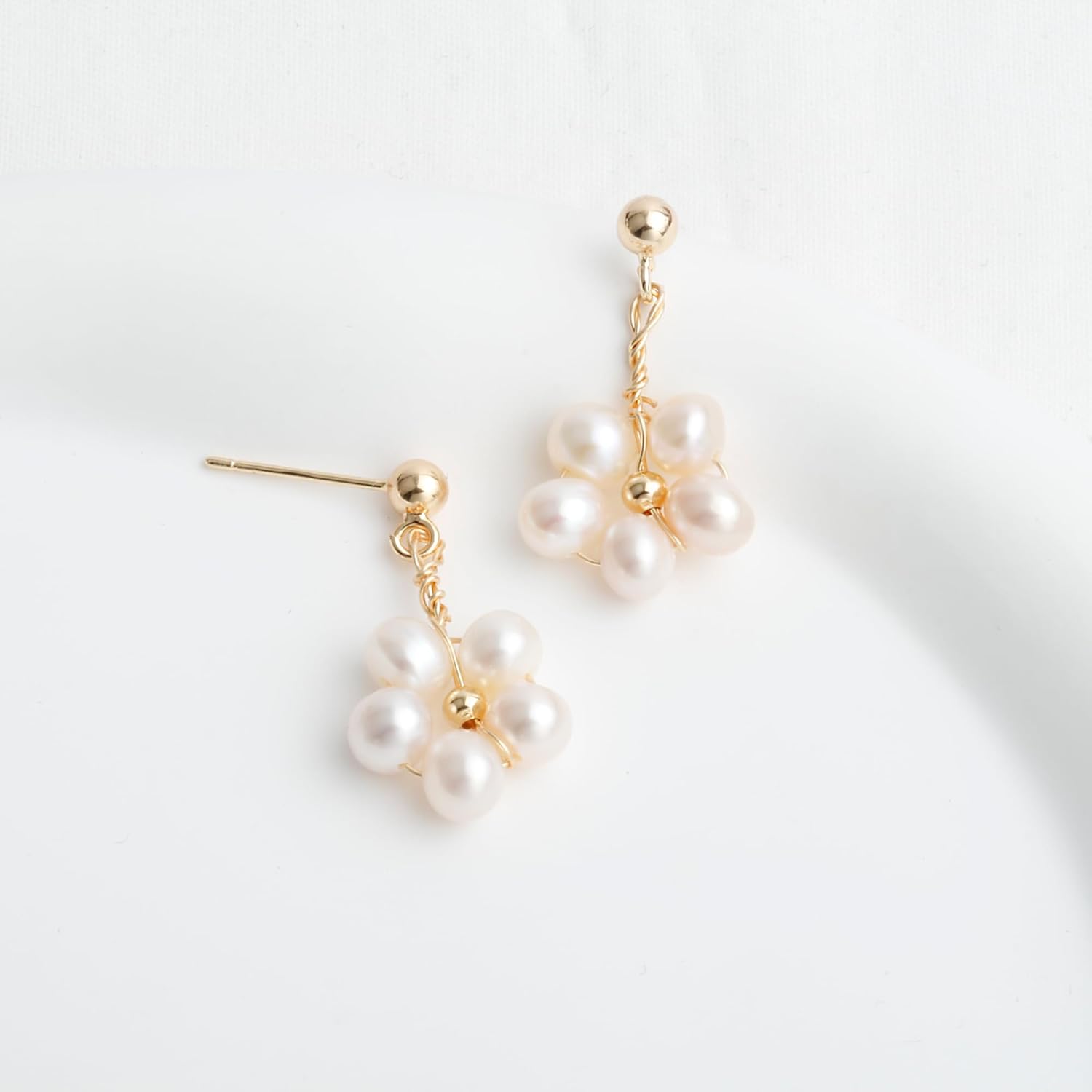 This is a pair of pearl dangle earrings made from 14K gold plated copper wire, handmade with love by our very experienced artisansPearls earring is specially designed as a flower pattern with 5 cultured freshwater pearls base which looks classy