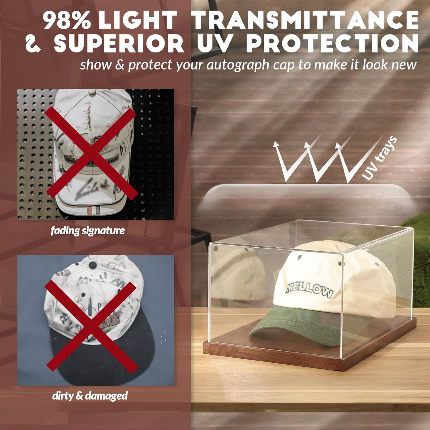 Classy wooden base for elegant display and show to friends Super clear to show the cap and signature on the cap High quality acrylic, thick enough and hard to break UV protected, saves your precious baseball hat from fading Solid wood riser hold the cap firmly in place, creating a stunning display large acrylic box is capable of holding a full-size baseball hat Nice package to be an ideal gift for birthdays and holidays, suitable for different decorations such as modern, farmhouse, and rustic