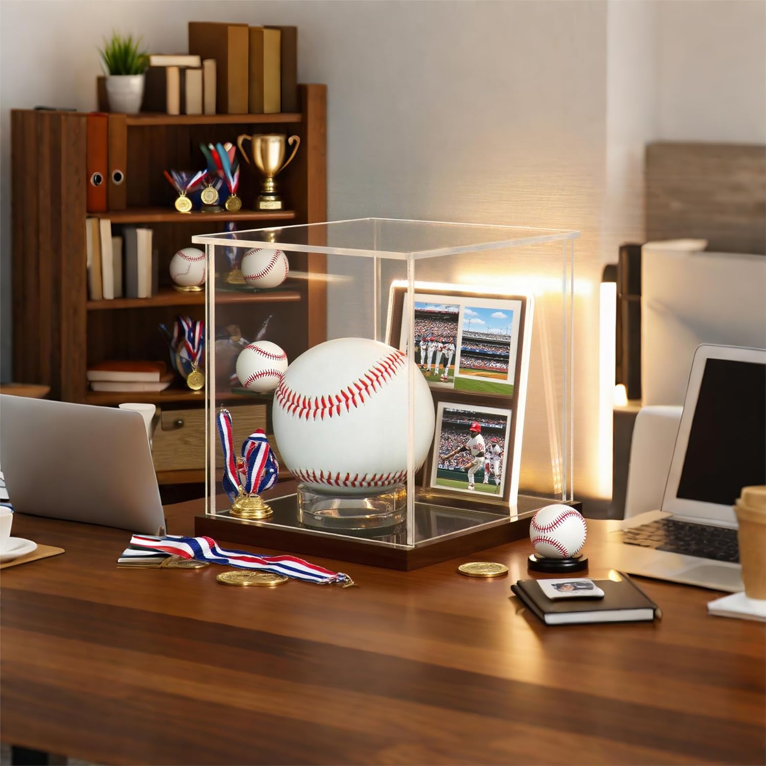Multi-Sport Compatibility with LED Lighting: This acrylic case fits standard baseballs, hockey pucks, tennis balls, and shuttlecocks. The built-in soft three-color LED lighting enhances visibility and adds a warm visual effect in low-light settings