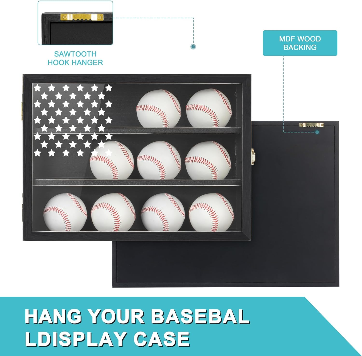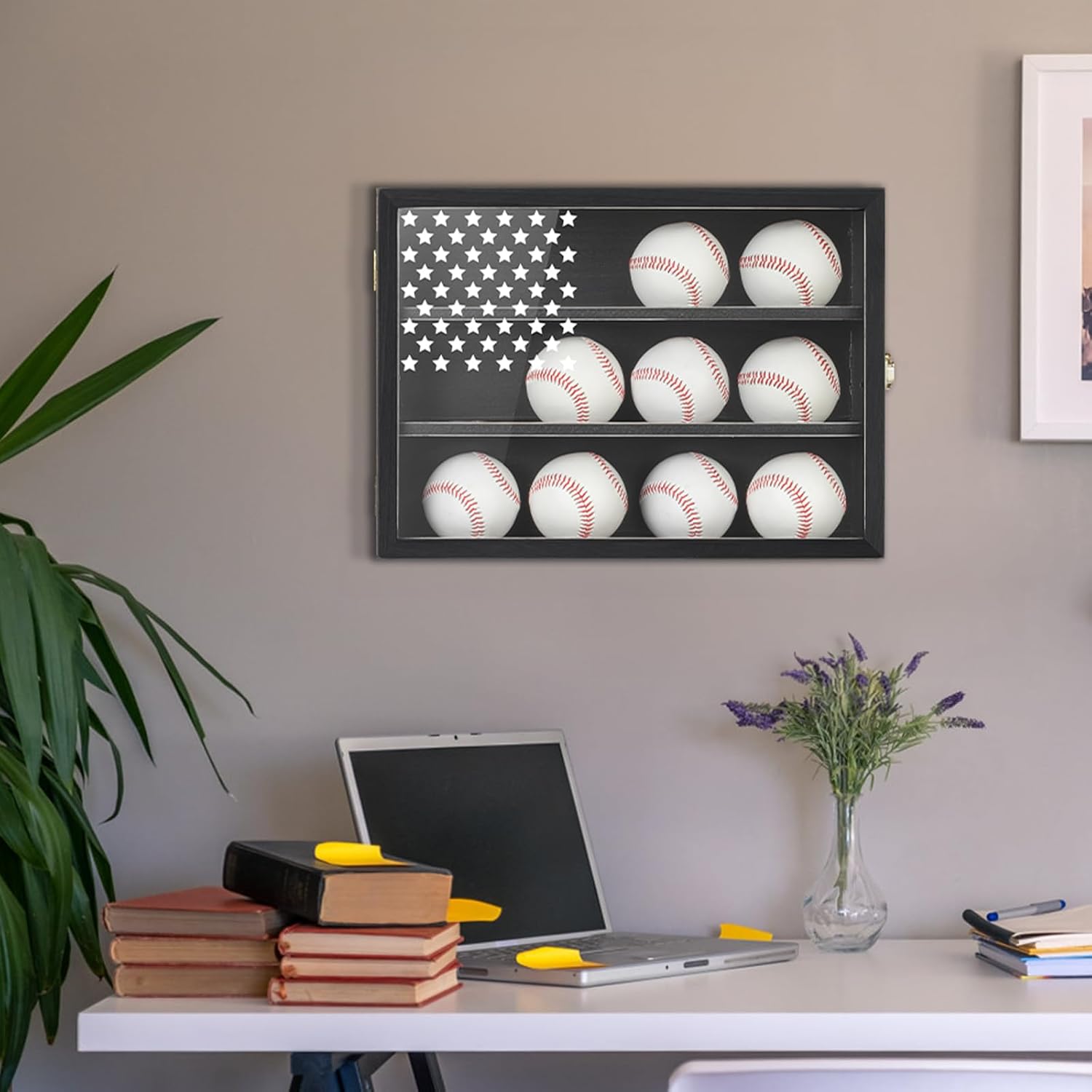 STUNNING DESIGN: Designed to impress, this sleek black rectangular cabinet features iconic American flag detailing that celebrates America’s favorite pastime. The handsome wooden construction commands attention in any room, while the secure gold-plated lock adds both protection and a touch of sophistication. This is a statement piece for true baseball enthusiasts