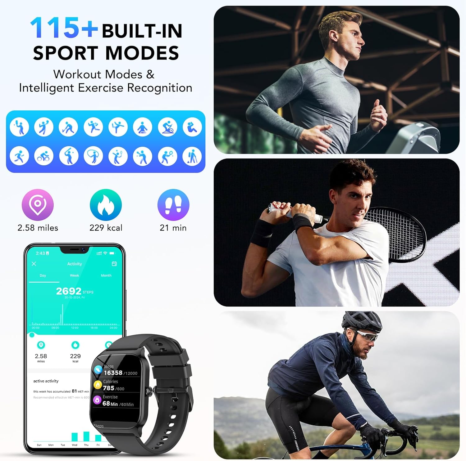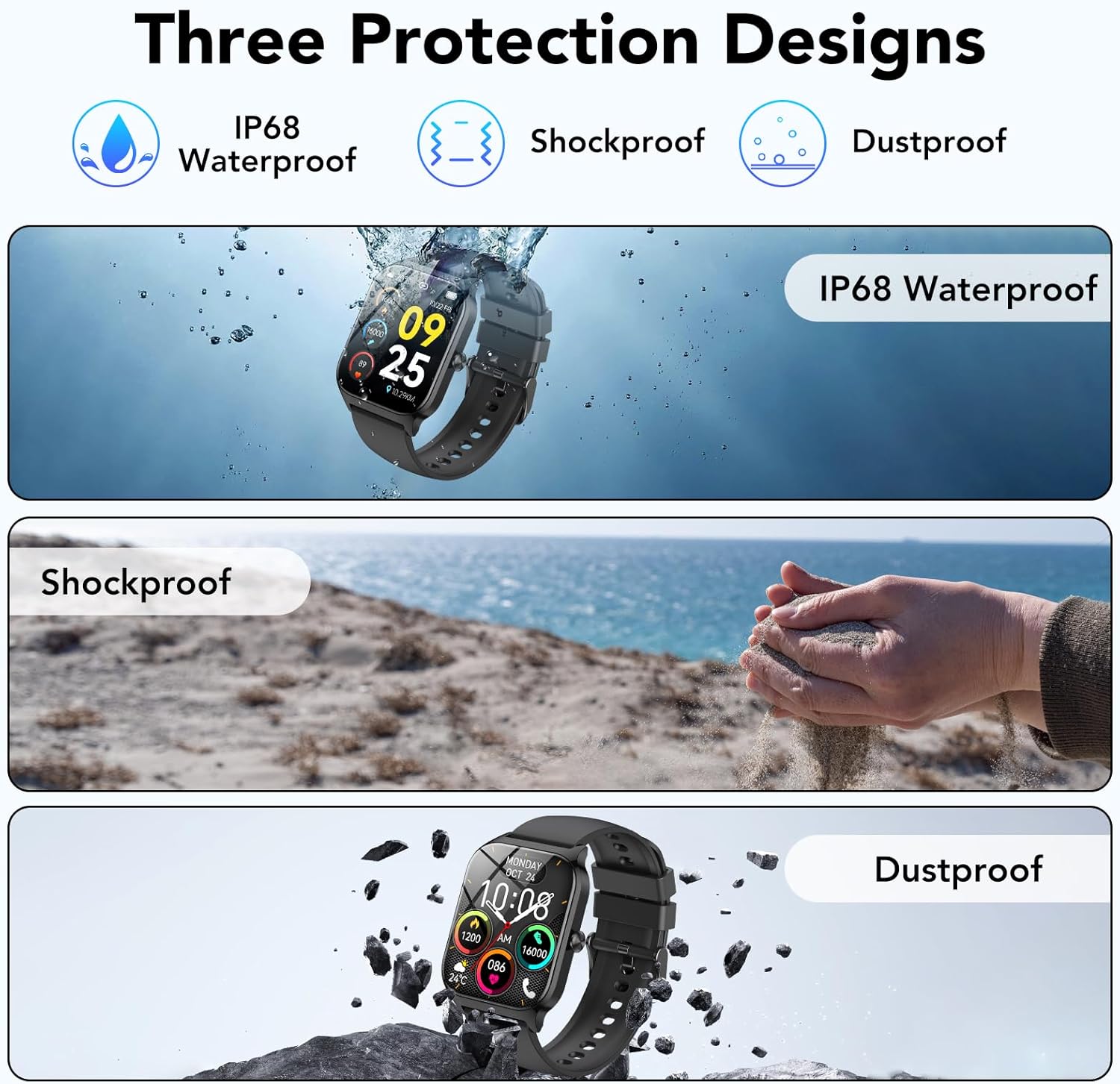 【115+ Sport Modes and IP68 Waterproof】The smartwatch for men features 115+ sport modes such as walking, running, cycling, jumping rope, badminton, basketball, football, hiking, yoga, etc. You can adjust your workout programme according to your activity status. With built-in 3-axis gravity sensor, the running watch accurately records daily steps, distance and calories for safer and more effective exercise.IP68 waterproof rating allows you to wear it in the rain, while washing your hands or sweating.