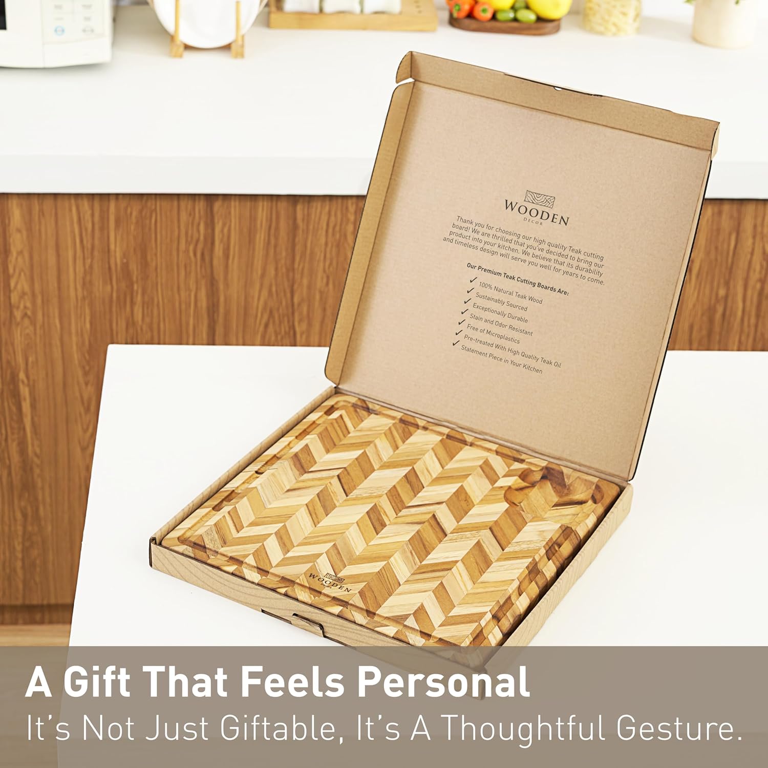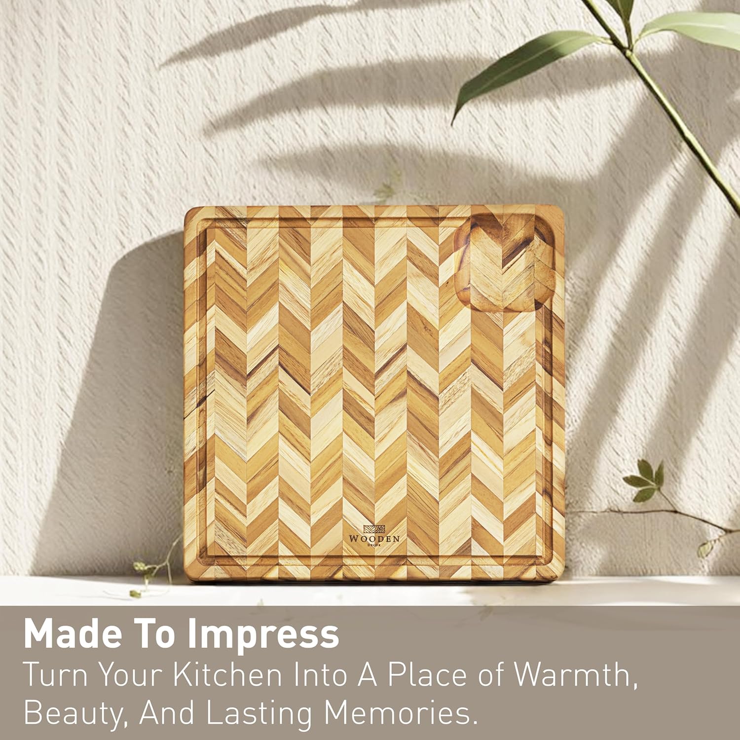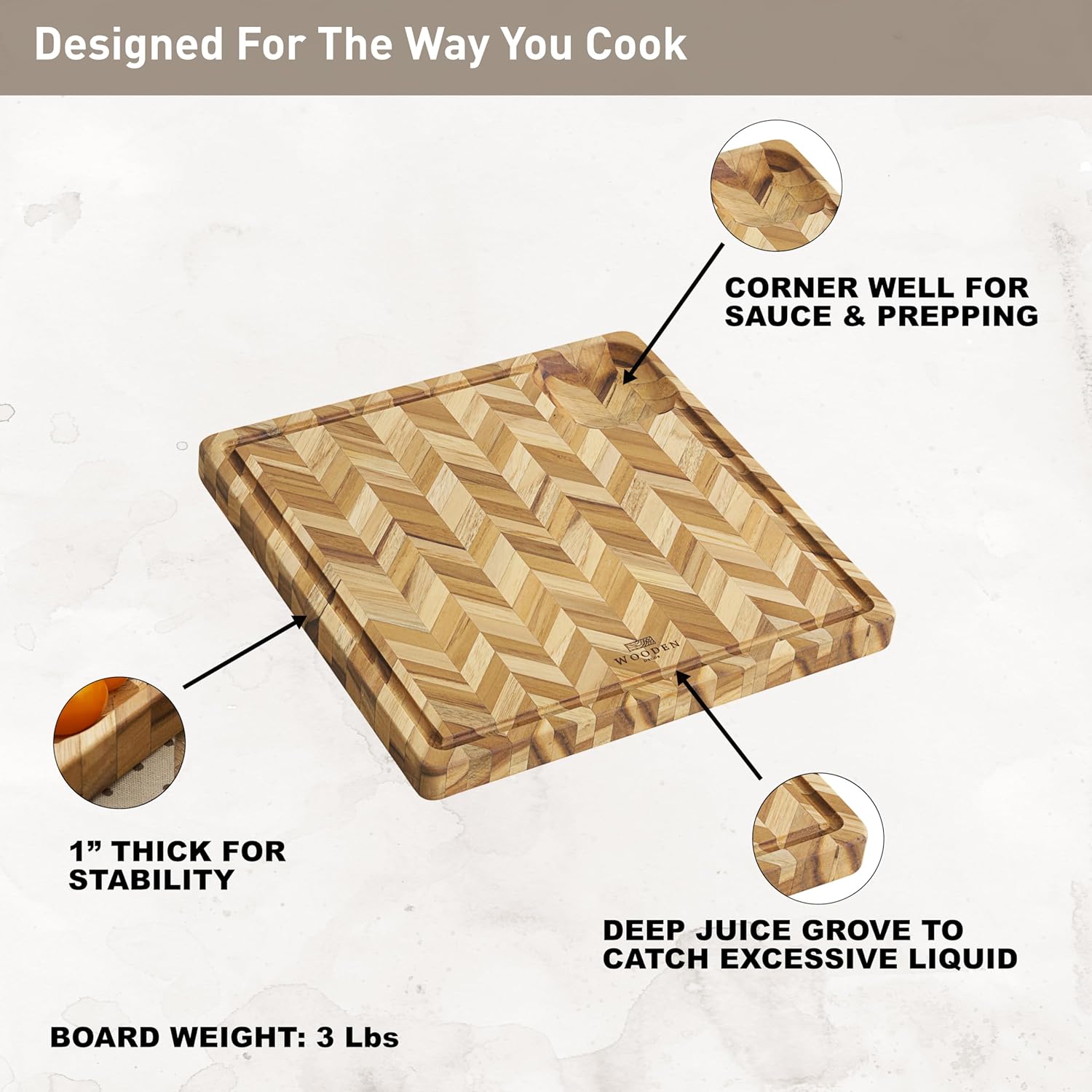 Premium Teak Cutting Board for Kitchen Use – Crafted from 100% solid South American teak wood, this beautifully designed wooden cutting board features a unique herringbone pattern that adds a touch of elegance to any kitchen. Measuring 11.8 x 11.8 inches with a sturdy 1-inch thickness and weighing 3 lbs, it delivers everyday functionality with a stylish, high-quality finish—ideal for prepping, serving, or display.