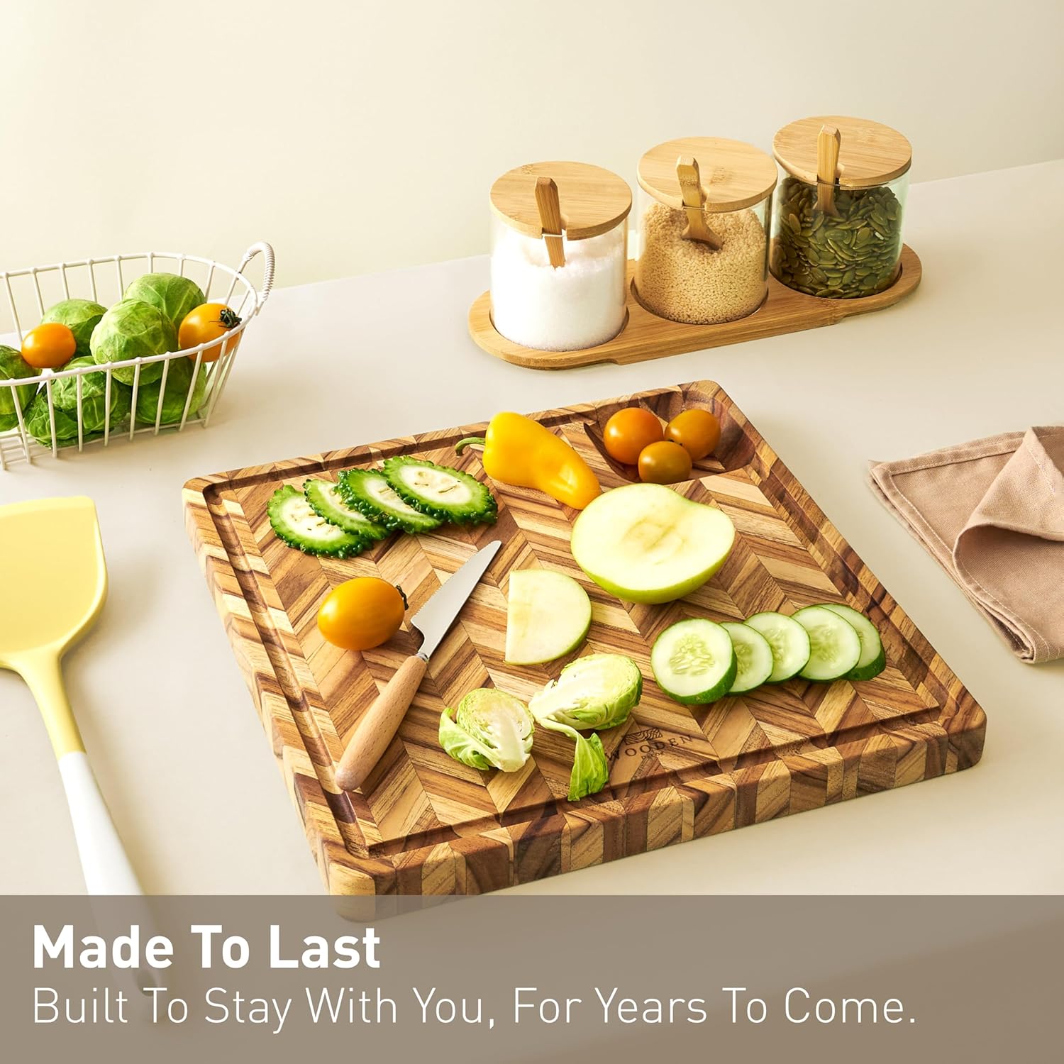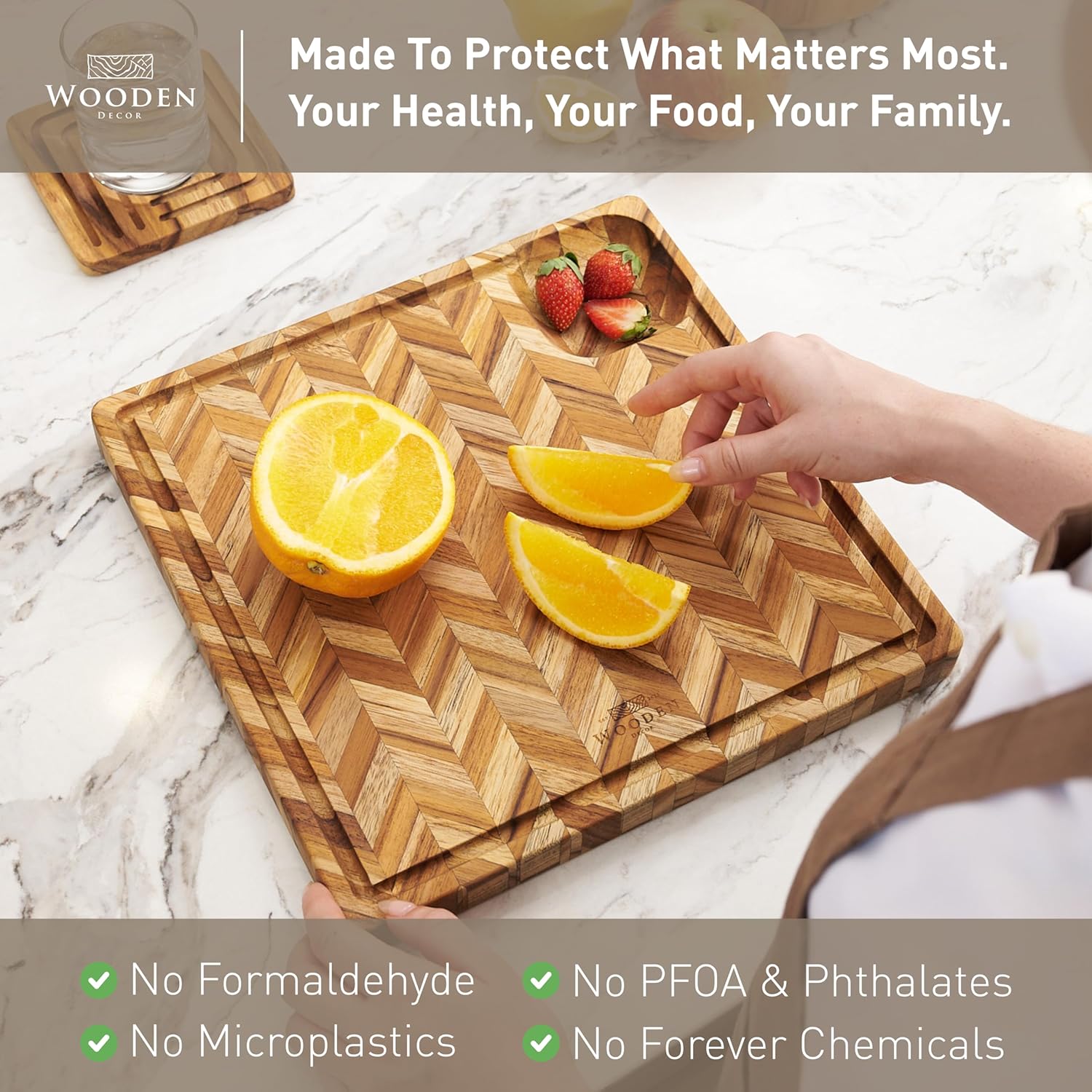 Premium Teak Cutting Board for Kitchen Use – Crafted from 100% solid South American teak wood, this beautifully designed wooden cutting board features a unique herringbone pattern that adds a touch of elegance to any kitchen. Measuring 11.8 x 11.8 inches with a sturdy 1-inch thickness and weighing 3 lbs, it delivers everyday functionality with a stylish, high-quality finish—ideal for prepping, serving, or display.