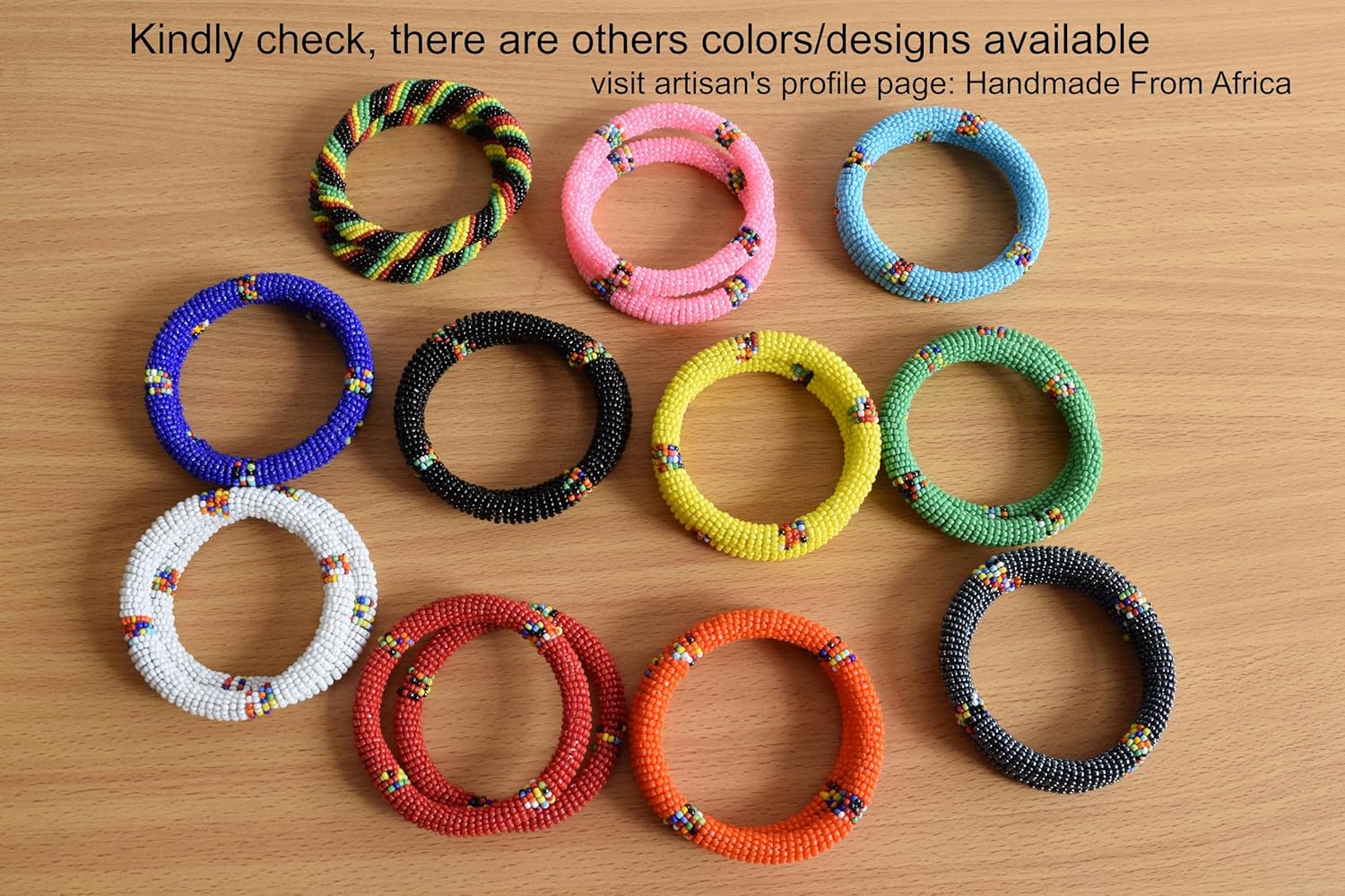 This beautiful Set of 3 African Maasai Beaded Bangles is Handmade by our Artisans specialized in beads bracelets. The beads are put on a string one by one, and rolled around a rubber tube. The entire process is made by hand. Diameter: approximately 2.5” inside and 3.25” outside. Please note, this bangles do not extend, they fit easily on smaller/medium hands.