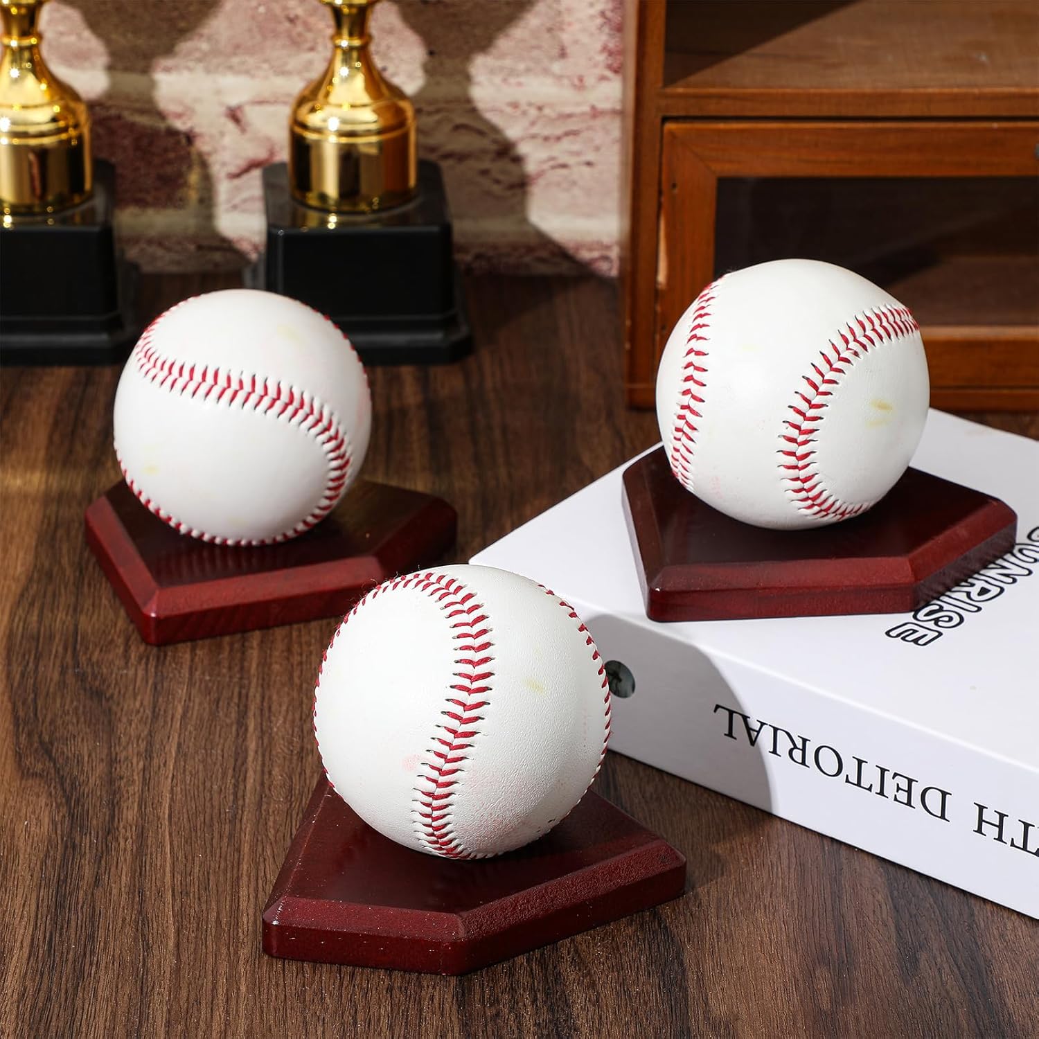 Product Package: this baseball stand holder features 3 walnut colored wooden pentagonal bases, offering a stylish and sturdy display solution for autographed balls and memorabilia; Suitable for decorating tables, creating centerpieces, or gifting to baseball fans