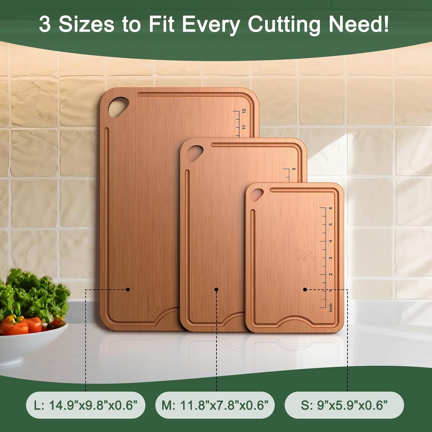 Various Sizes for Every Task: The HUAXUS bamboo cutting board set includes large, medium, and small boards (15×9.8″, 11.8×7.8″, 9×5.9″) to expertly handle every kitchen task. Perfect for handling large roasts, everyday chopping, and serving cheese or appetizers—all your kitchen needs covered.