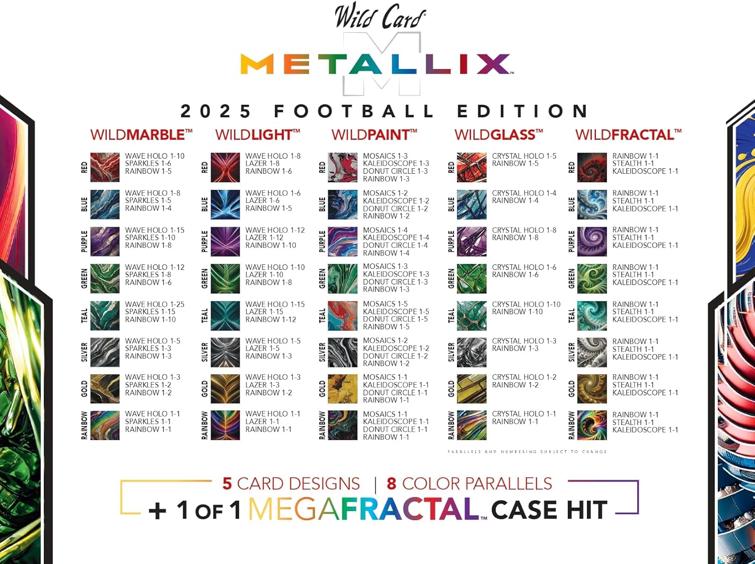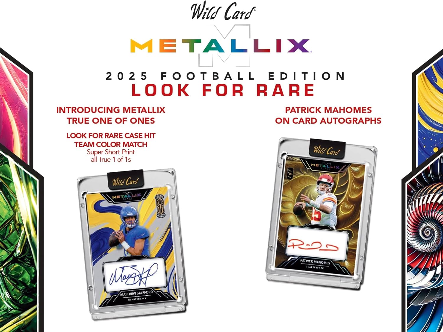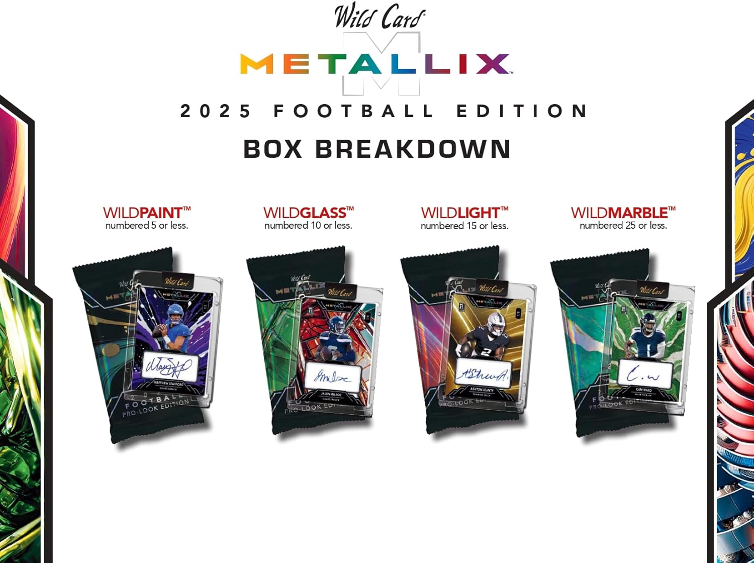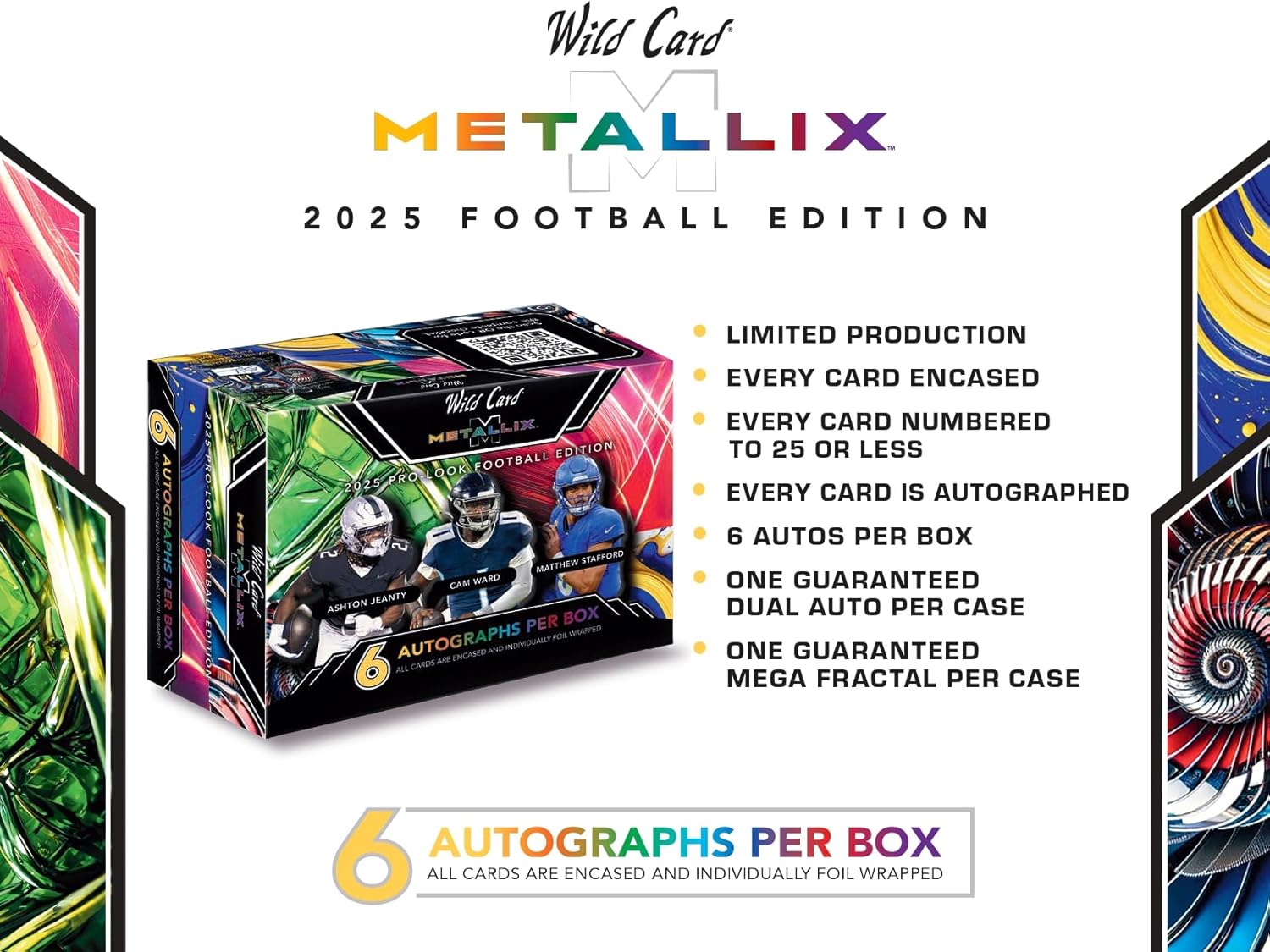 – Wild Card Metallix Pro-Look Football includes autographs from various football players such as Ashton Jeanty, Cam Ward, Matthew Stafford, and more!