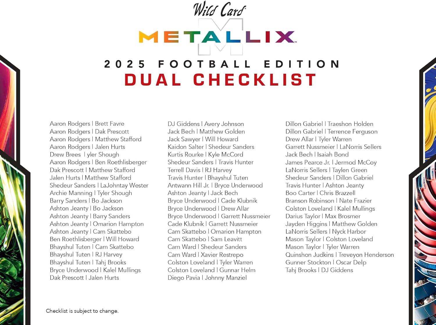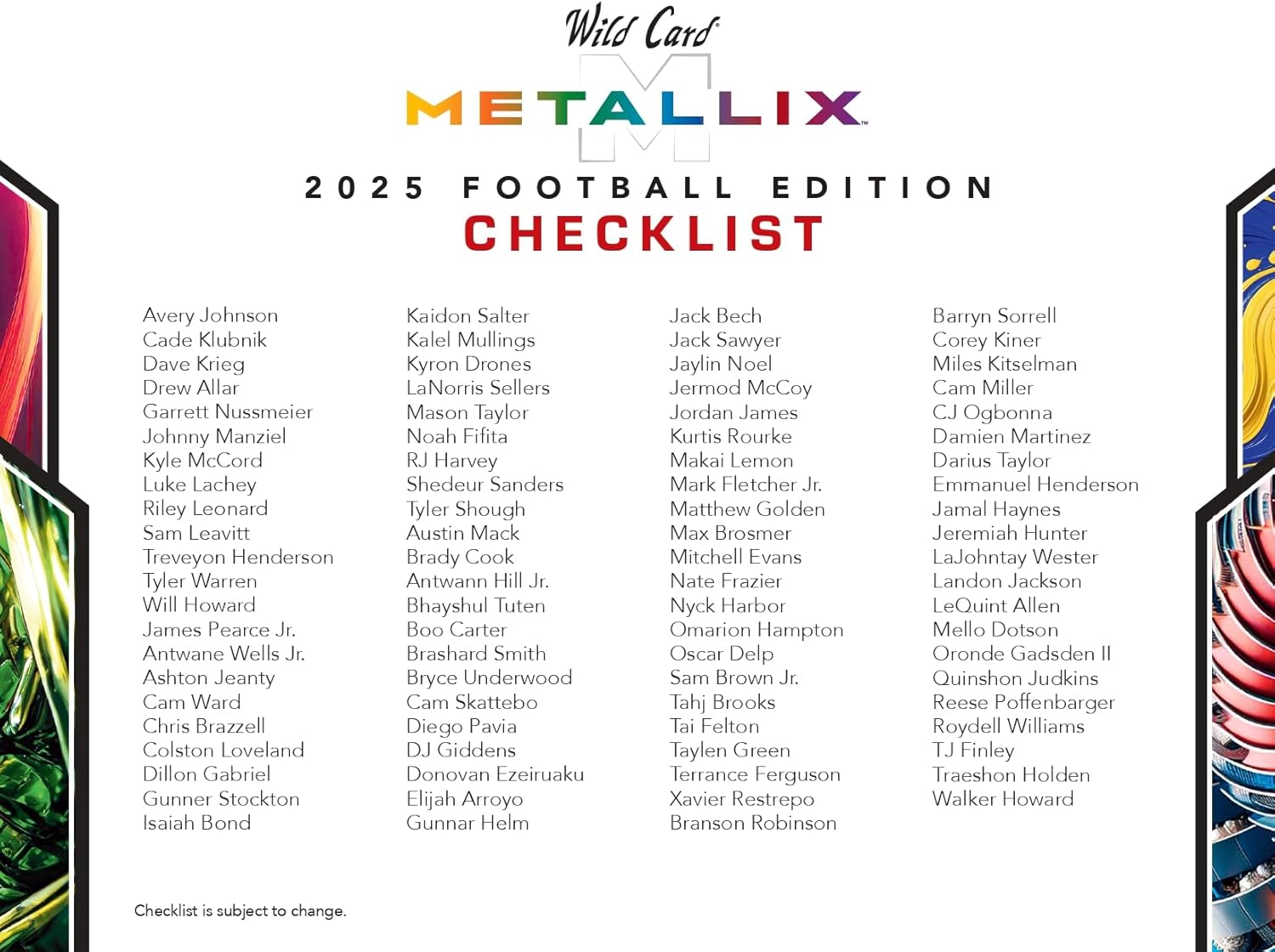 – Wild Card Metallix Pro-Look Football includes autographs from various football players such as Ashton Jeanty, Cam Ward, Matthew Stafford, and more!