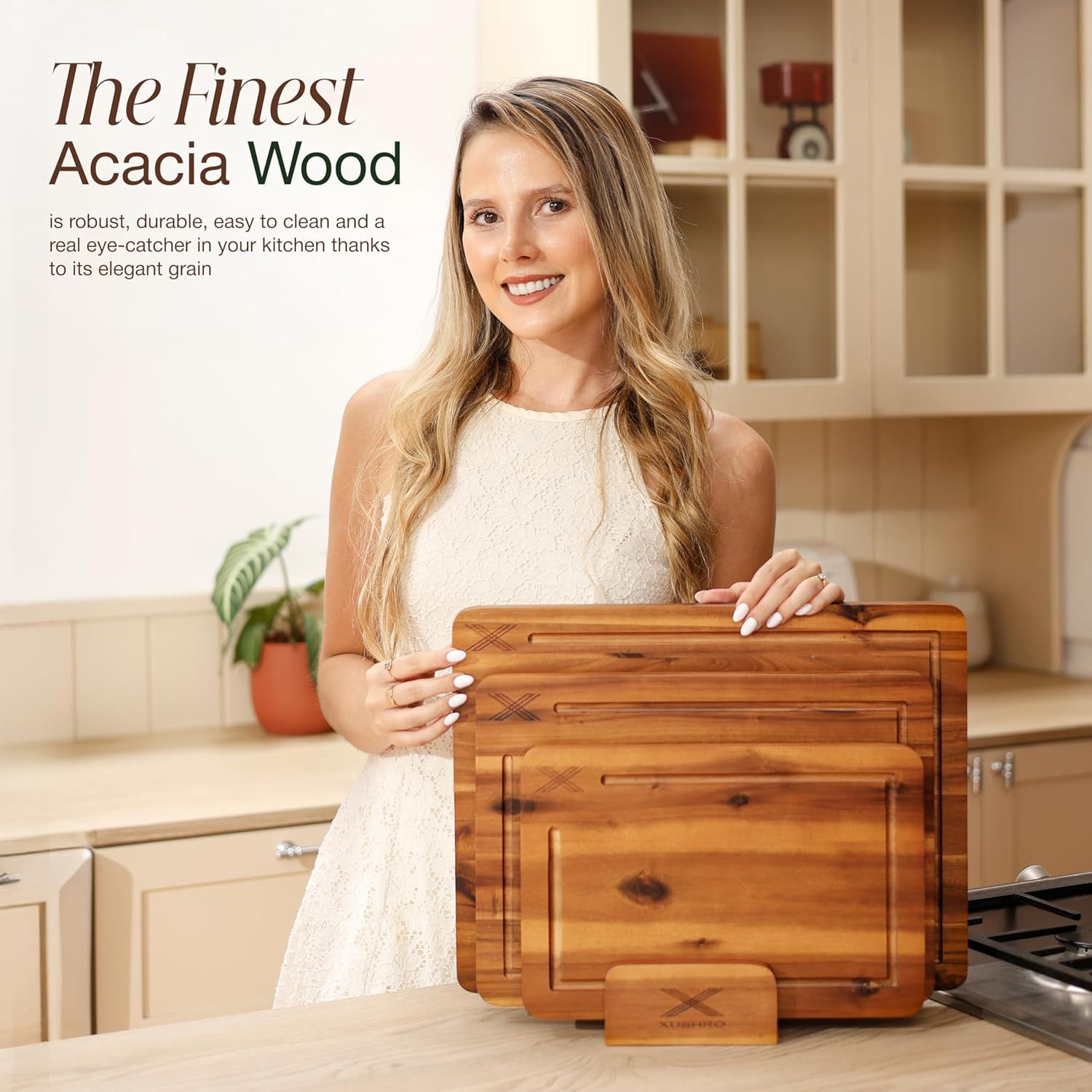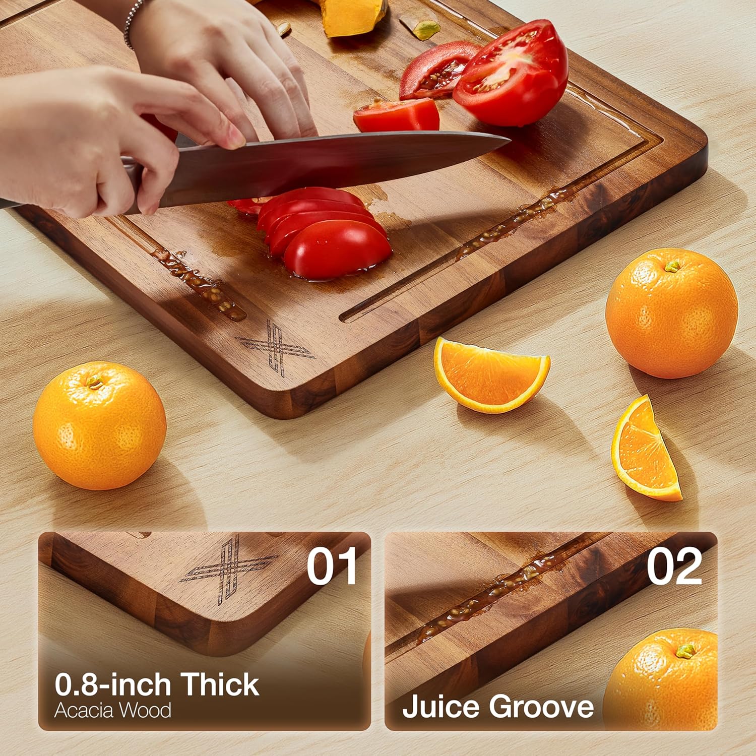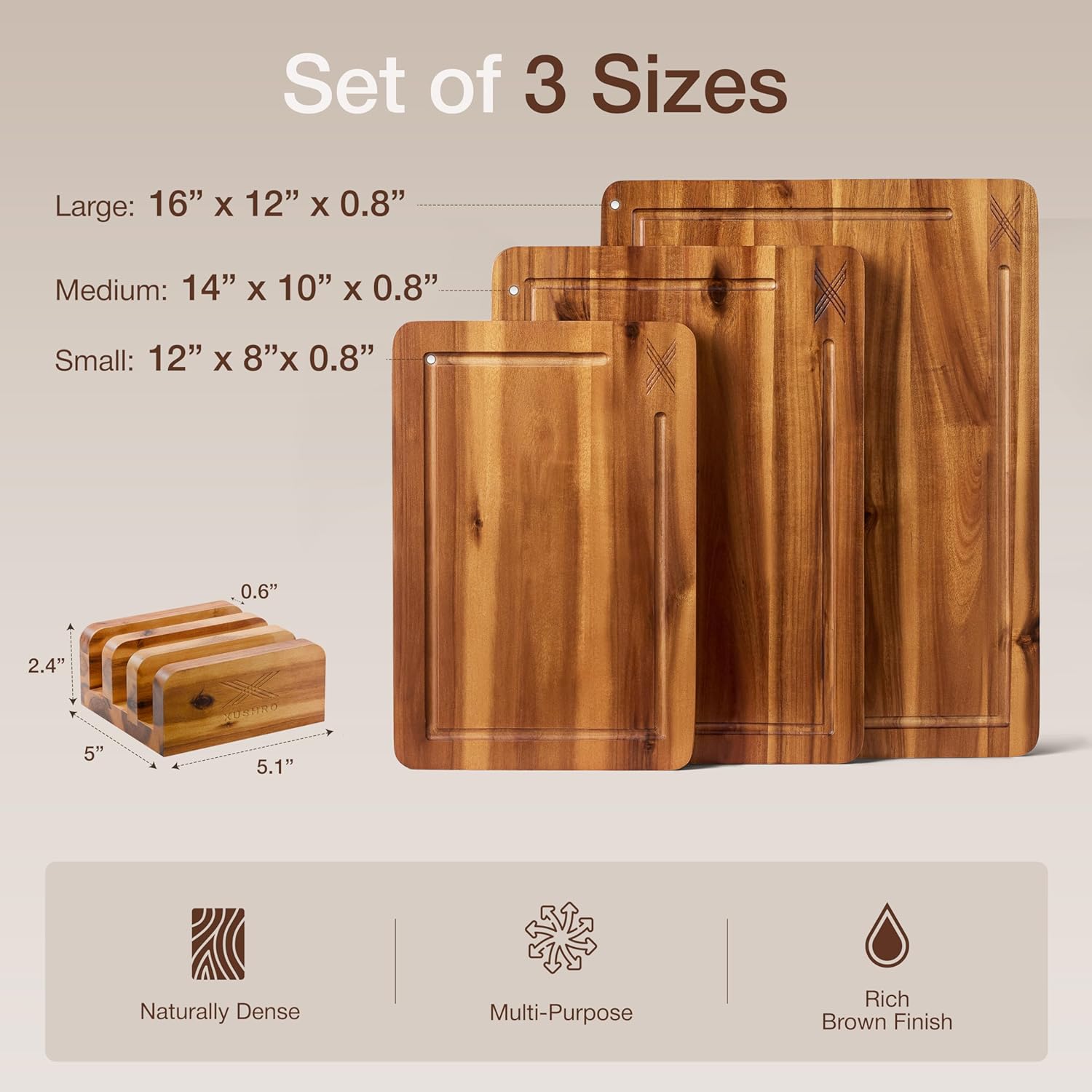Acacia Wood Cutting Board Set of 3 (16 x 12/14 x 10/12 x 8), Natural – 0.8 in Extra Thick Wooden Chopping Boards with Deep Juice Grooves – Non-Slip, Non-Toxic & Durable Boards for Meat & Vegetables