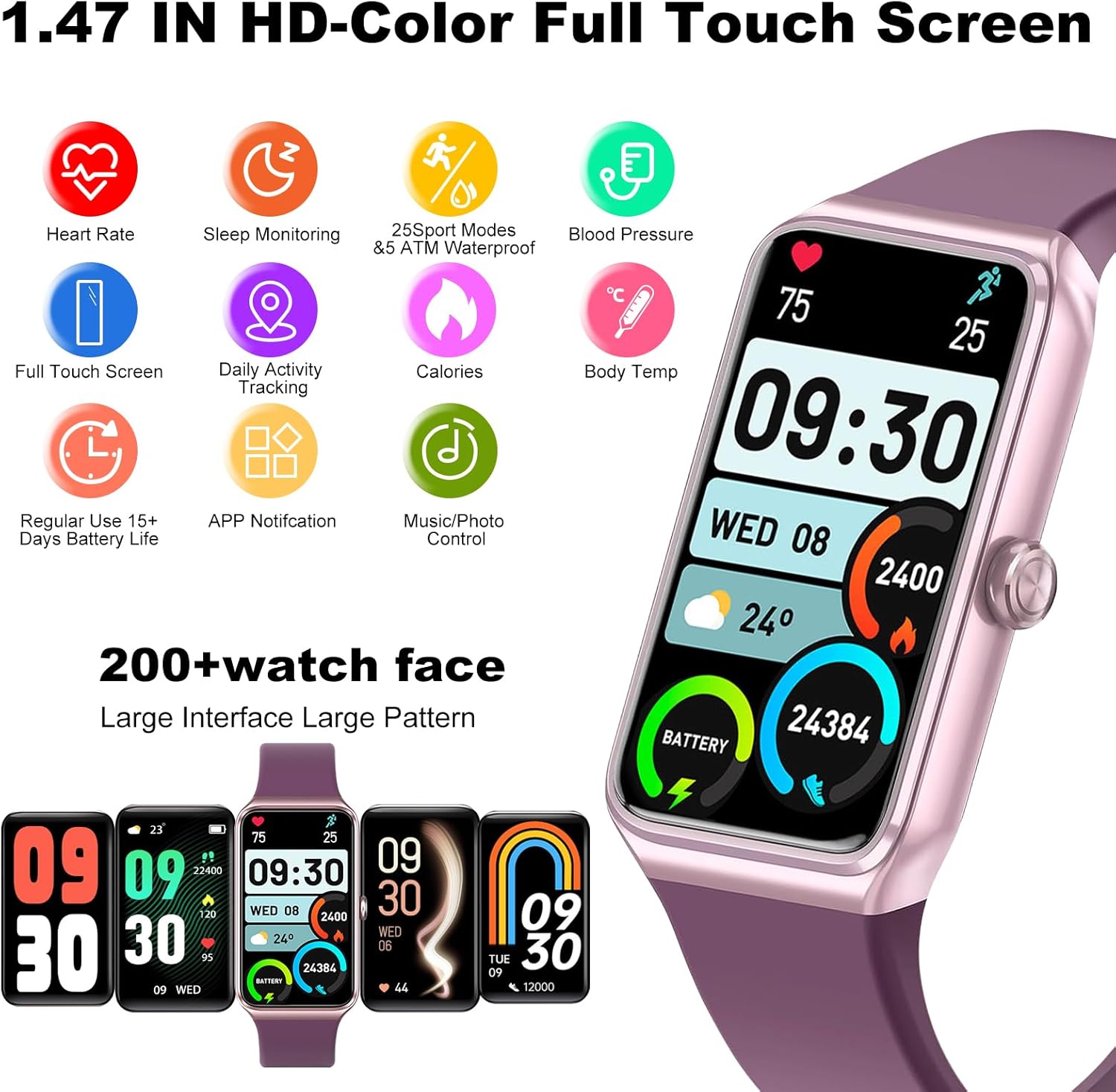 【1.47″ HD Color Full Touchscreen】The 1.47″ curved HD color display with full touchscreen functionality delivers an enhanced visual and interactive experience. Everything is easy to see and navigate, making this fitness tracker not only beautiful but also intuitive to use. Choose from over 150 customizable watch faces in the app, or upload your own photos to create a personalized look that suits your mood and occasion.
