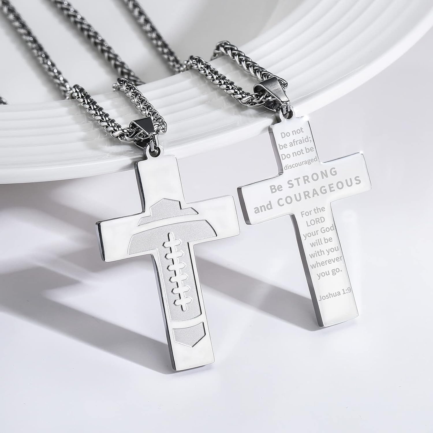 Football Cross Necklace for Boys Men Stainless Steel Bible Verse Pendant with 20+2 Inch Chain First Communion Baptism Religious Sports Jewelry Gift