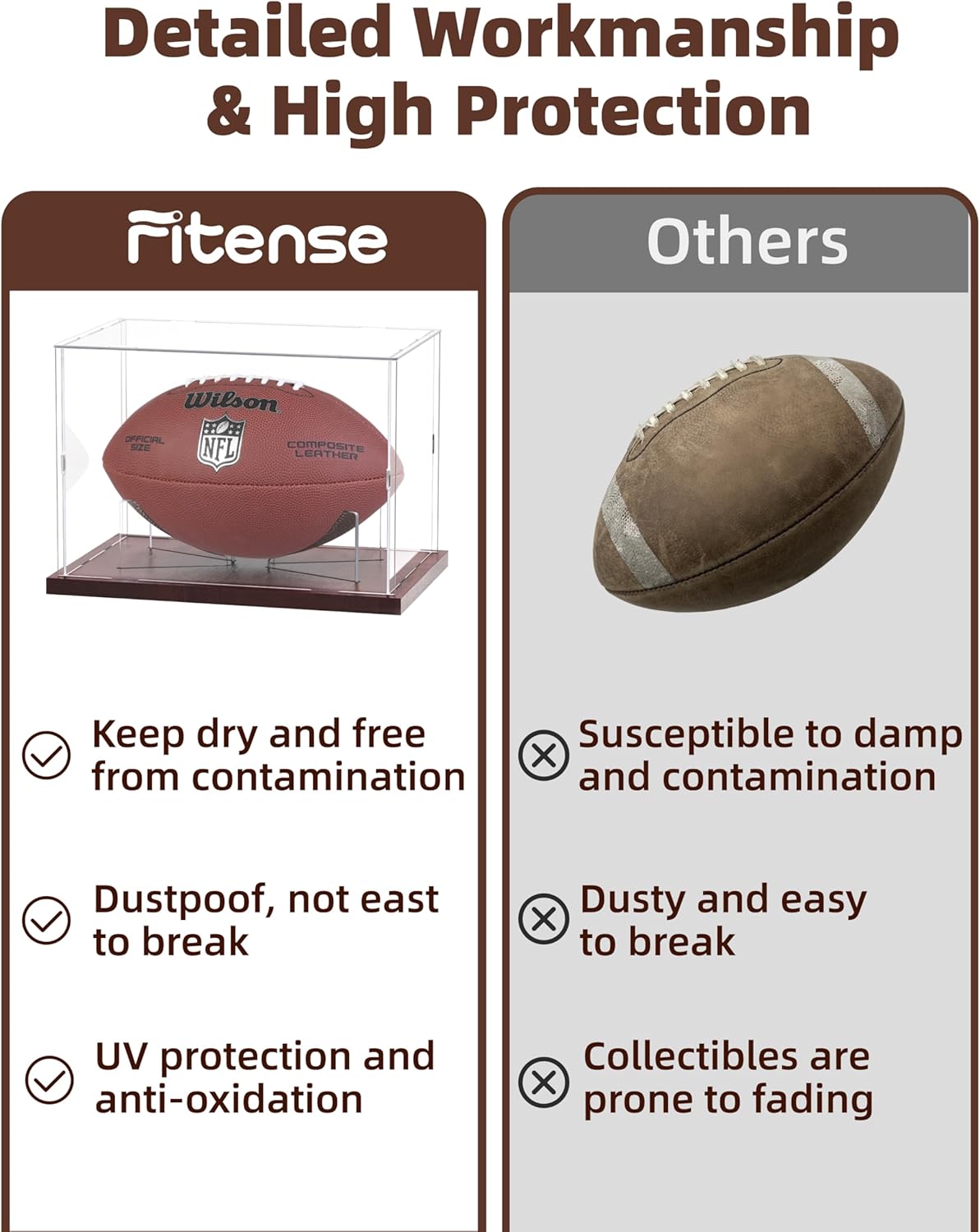 Hassle-Free Assembly & Innovative Design: Experience the convenience of Fitense football display case, ingeniously crafted for easy setup and interaction. Features traditional mortise and tenon joints for stability and durability, no nails or glue needed to quickly assemble the acrylic box. Just 1 Minute, all done! PS: Before assembly, please remove the protective film from the acrylic border