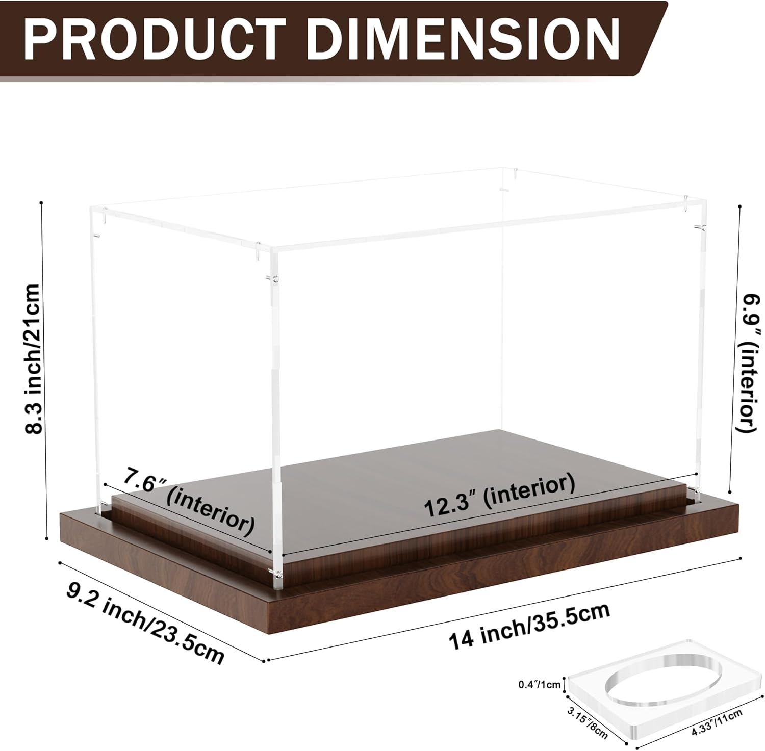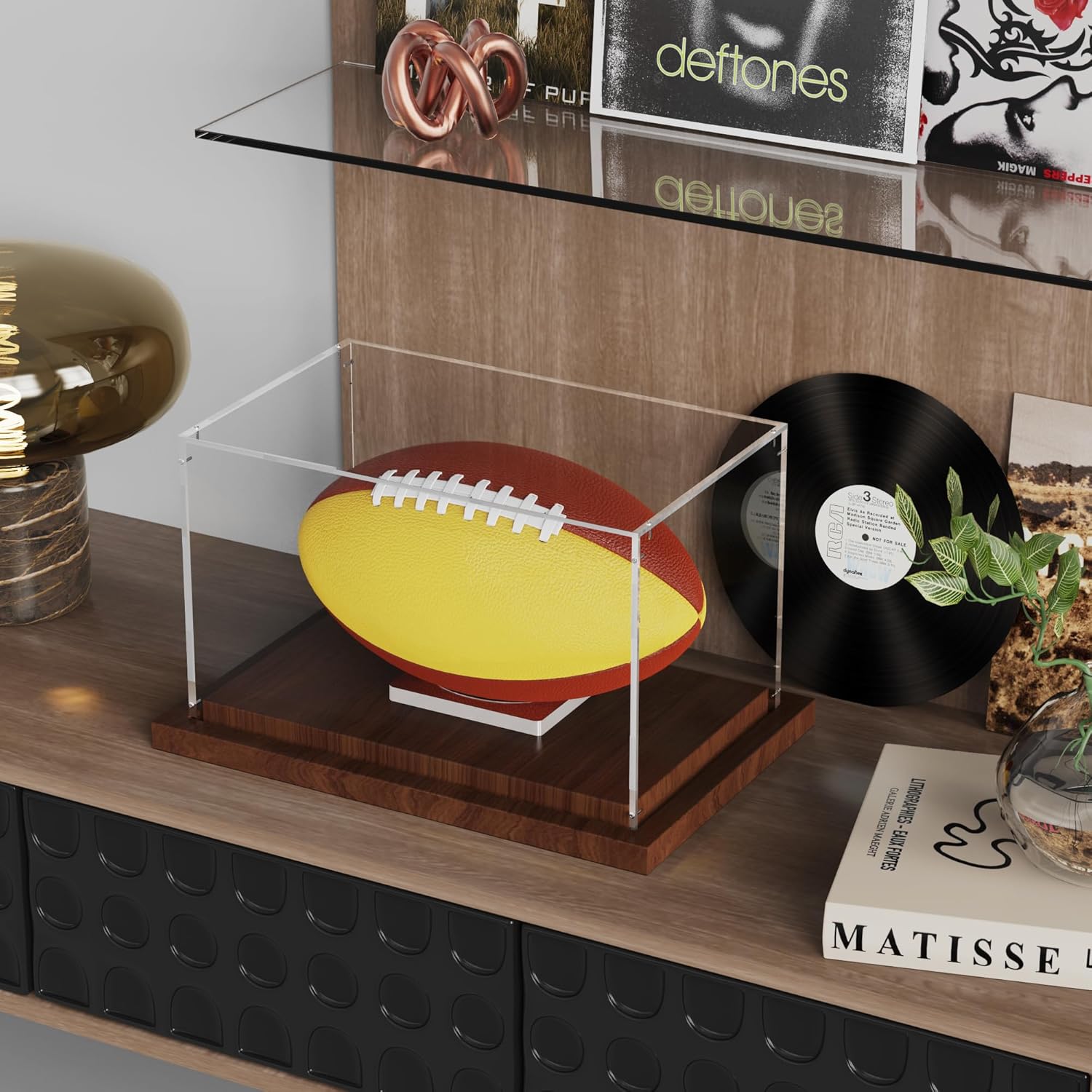 Football Display Case Dimensions: Exterior: 14”L x 9.2”W x 8.3”H; interior: 12.3”L x 7.6”W x 6.9”H. Football display case crafted with durable clear acrylic and a stylish wood base,offers robust protection while enhancing the display with a touch of elegance.