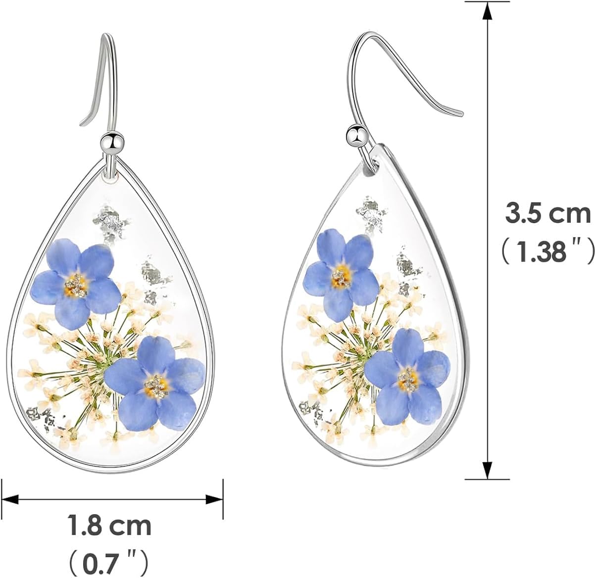 Forget Me Not and Queen Anne’s Lace Pressed Wildflower Earrings, Dainty Sterling Silver Drop Dangle Earrings for Women, Handmade Pressed Flower Teardrop Resin Dry Flower Earrings for Women Trendy