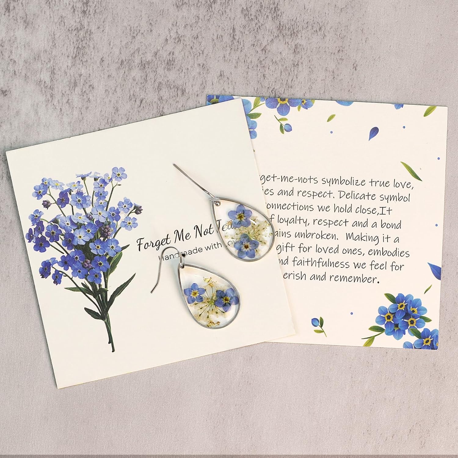 Forget Me Not and Queen Anne’s Lace Pressed Wildflower Earrings, Dainty Sterling Silver Drop Dangle Earrings for Women, Handmade Pressed Flower Teardrop Resin Dry Flower Earrings for Women Trendy