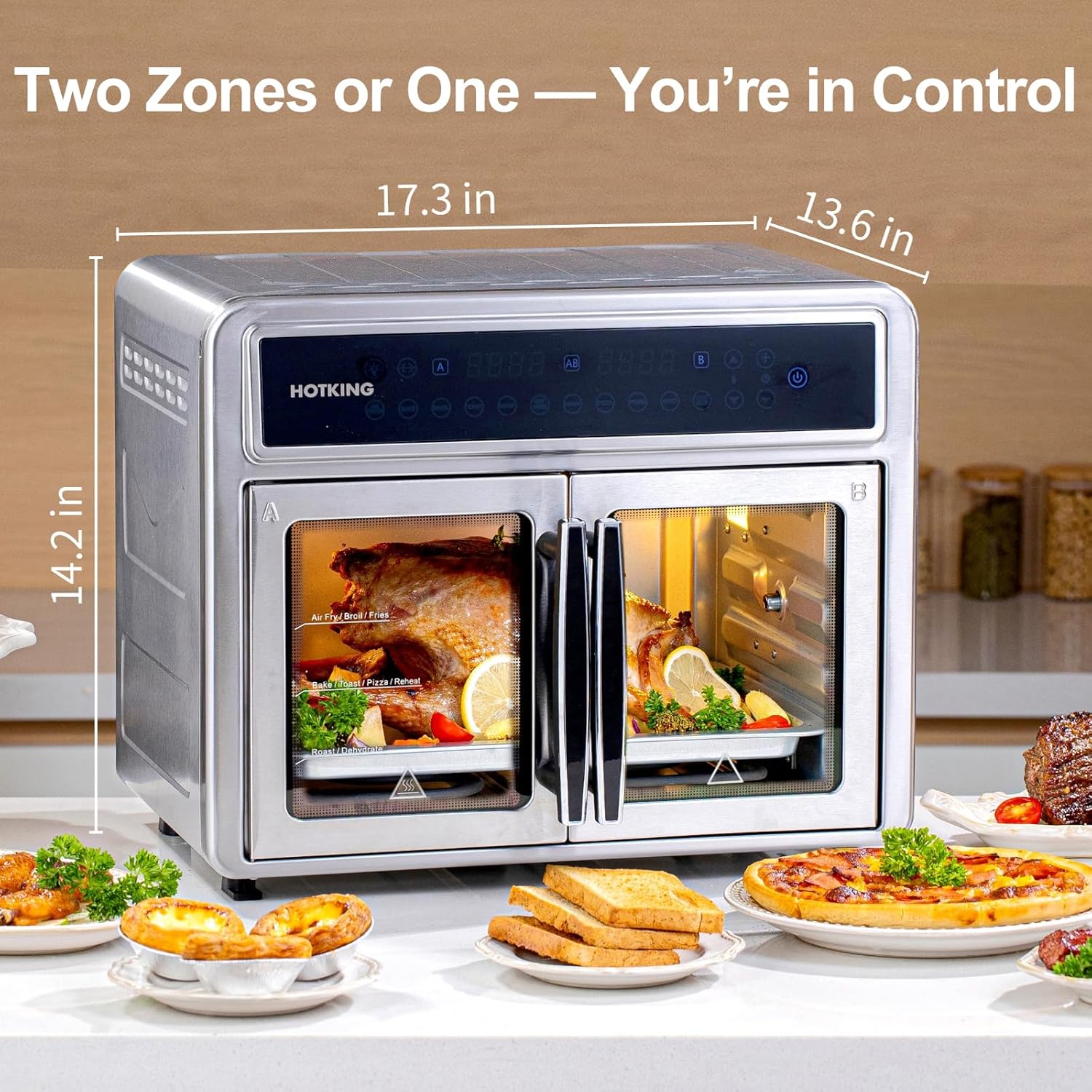 HotKing Dual-Zone Air Fryer Toaster Oven Combo, 28 QT Extra Large, Non Toxic Stainless Steel Convection Oven with French Door, Countertop Airfryer with Window, Racks, Rotisserie, Dehydrator, ETL Rated