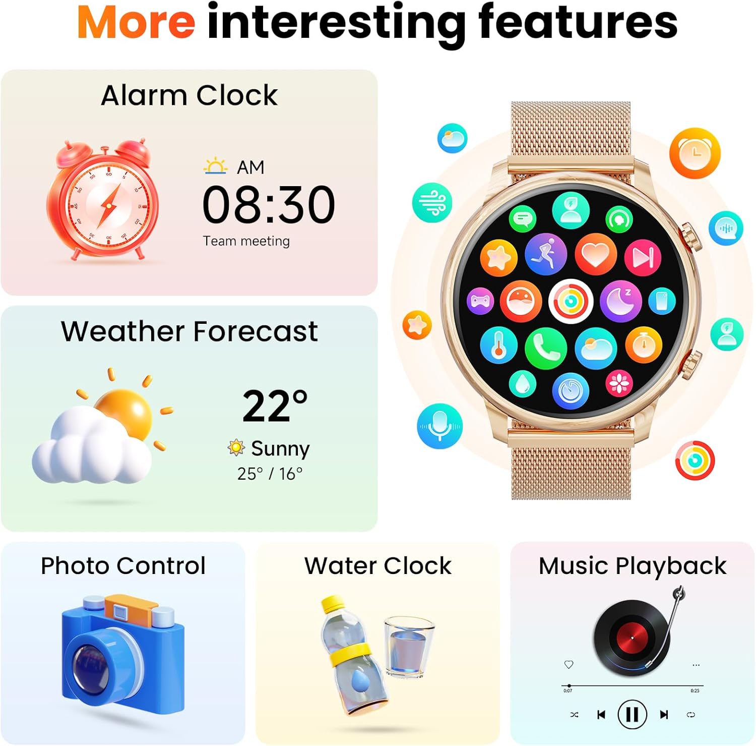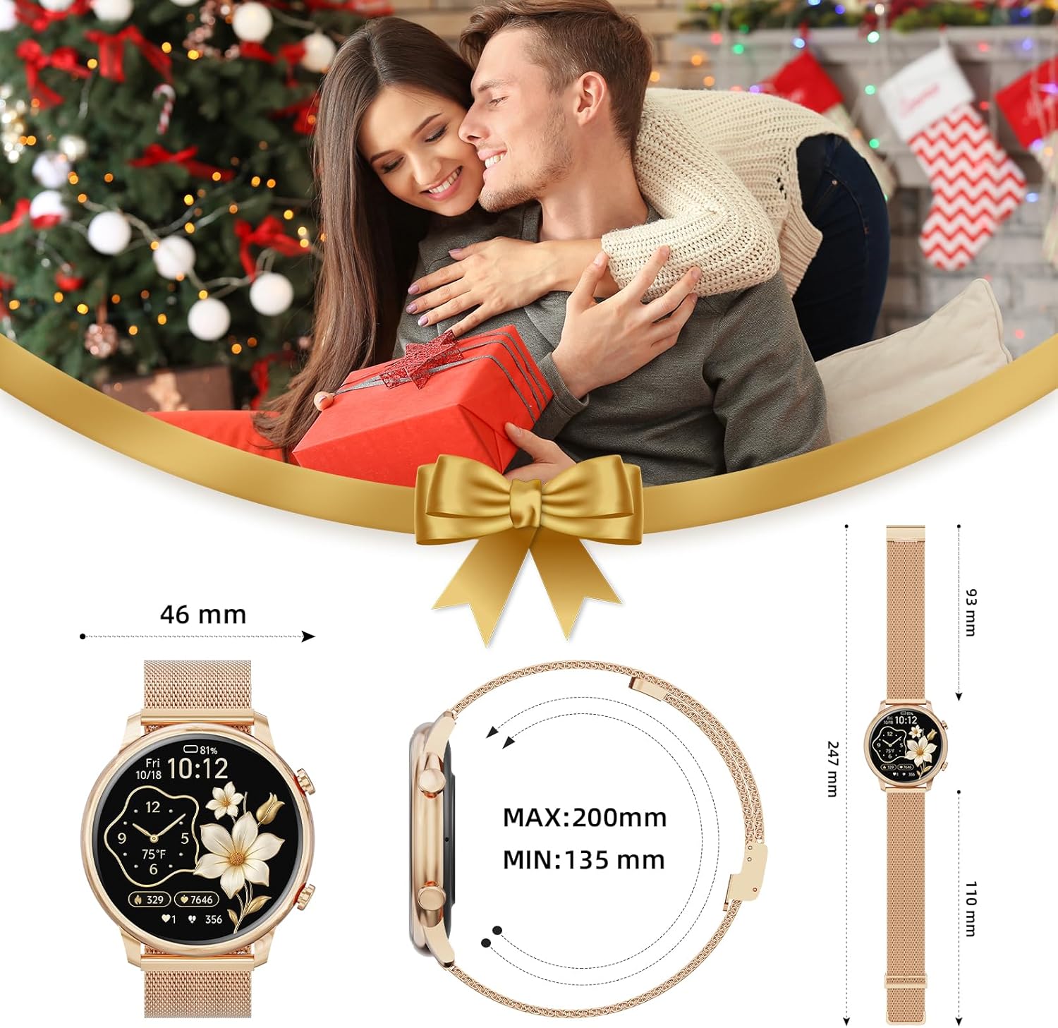 đăGold-plated Finish&For Most Wrist SizesăThis smart watch features a smooth, gold-plated body that embodies elegance and sophistication, making it ideal for both fitness activities and everyday wear. The 1.39-inch screen is suitable for most wrist sizes. The TFT HD display provides clear and sharp visual effects, the colors are more stunning.Customize the sports watch face with your favorite photos, such as selfies, pets, or landscapes, to express your personality!