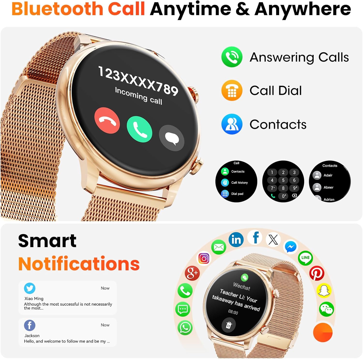 đăBluetooth 5.2 Call&Message NotificationăWith this Bluetooth call smart watches for women, You can make, answer and refuse a call on your wrist, also receive message/app notification, (Note: Can’t reply message) .