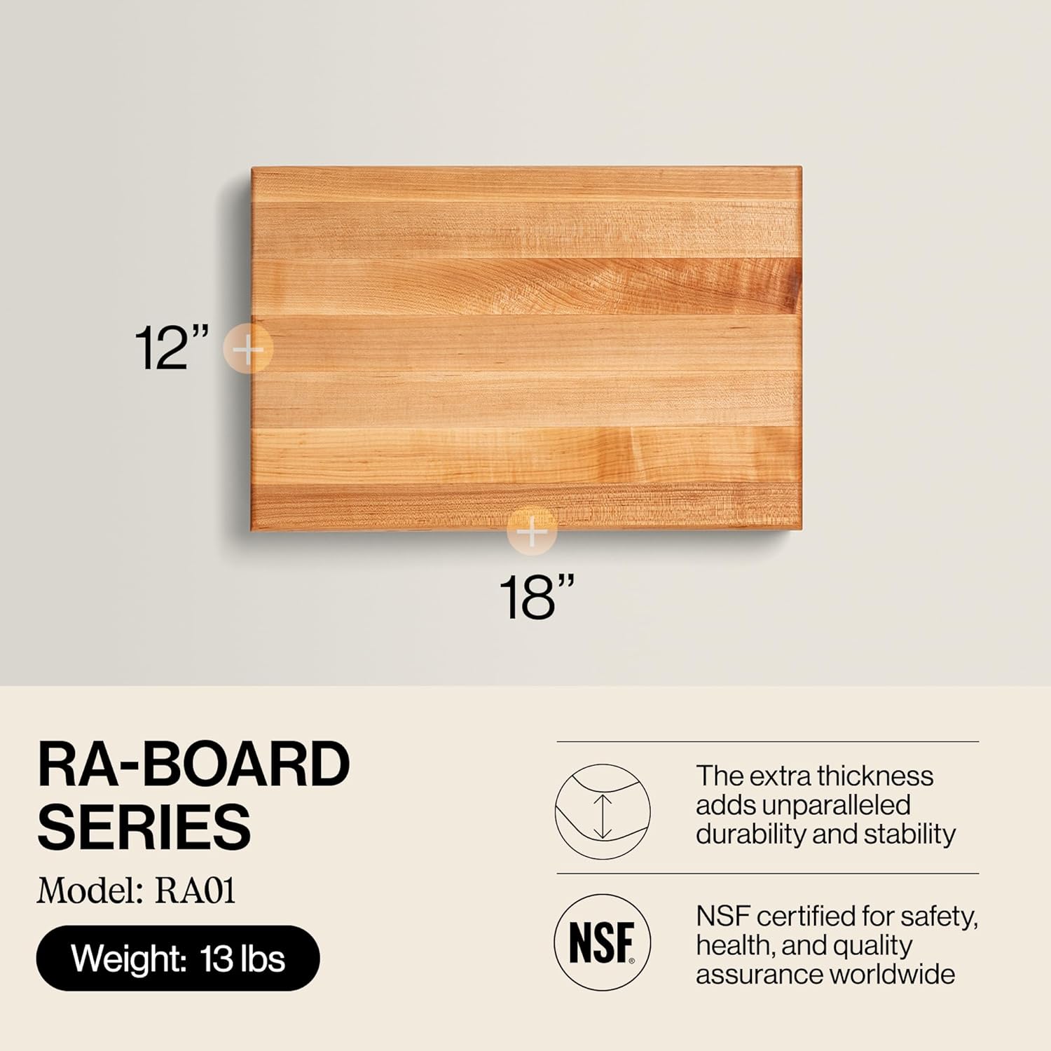 John Boos RA-Board Series Rectangular Wooden Maple Cutting Board 18”x12” – 2.25” Thick, 13-lb Reversible Butcher Block with Edge-Grain & Finger Grips – Made in the USA
