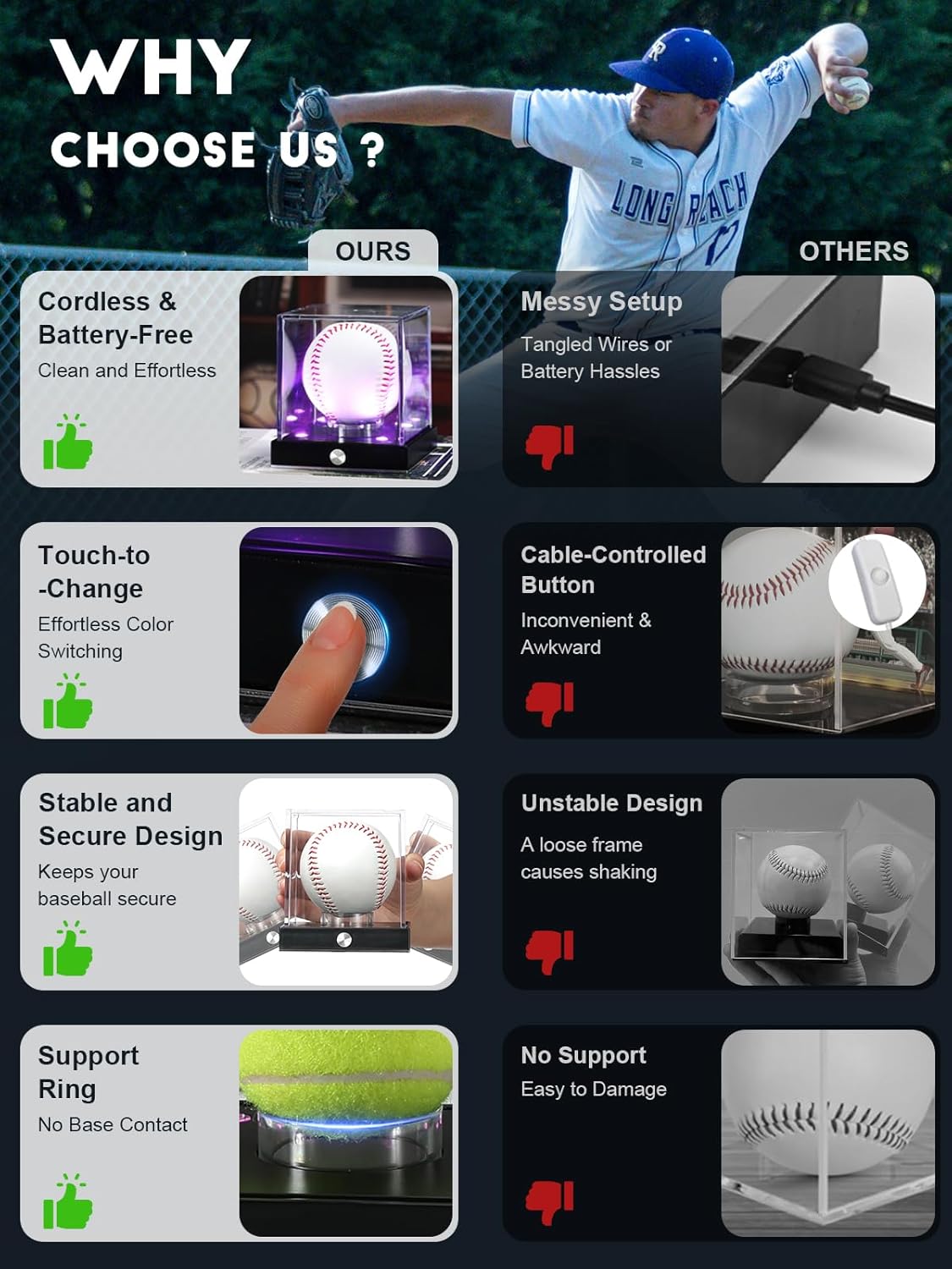 Rechargeable and cord-free, so you can showcase your baseball anywhere without worrying about outlets. Simple button control lets you switch on/off and cycle through 10 lighting modes with ease. Smart memory function remembers your last color or mode for effortless use every time. Built-in rechargeable design saves you from battery swaps while being kinder to the planet. High-transparency PC cover offers crystal-clear visibility from every angle. Versatile display case that also beautifully showcases crystals, fossils, and other collectibles. Elegant design and soft lighting make it the perfect gift for collectors and sports fans alike.