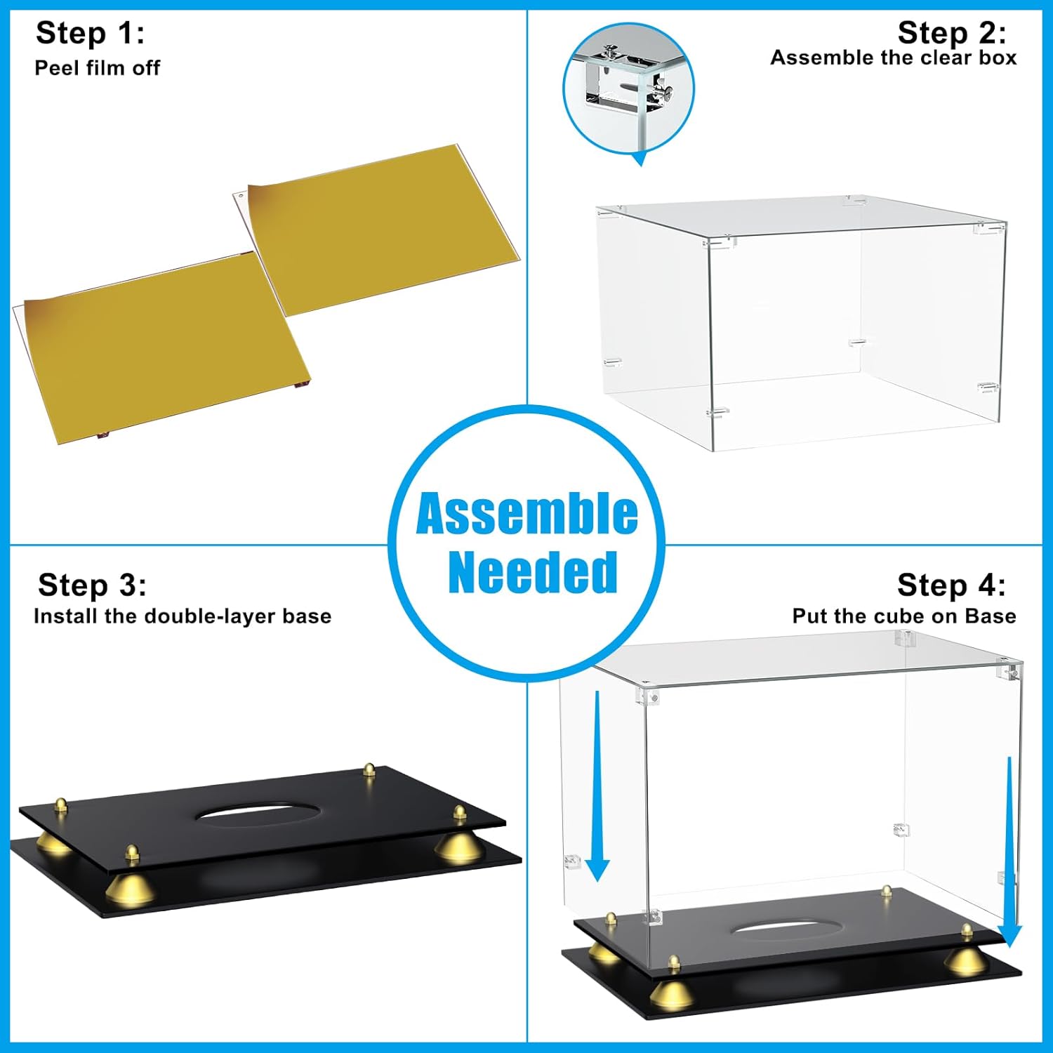 Easy to Assemble: Before assembly, please remove the yellow protective film on each part. First, install the double-layer black base. When installing, make sure to place the base with the circular groove on top of the one without the groove, and then connect them with screws. Then, assemble the transparent box by aligning the screw holes on the panels and tightening the screws. Finally, place the box on the base, and the football display case is ready to use