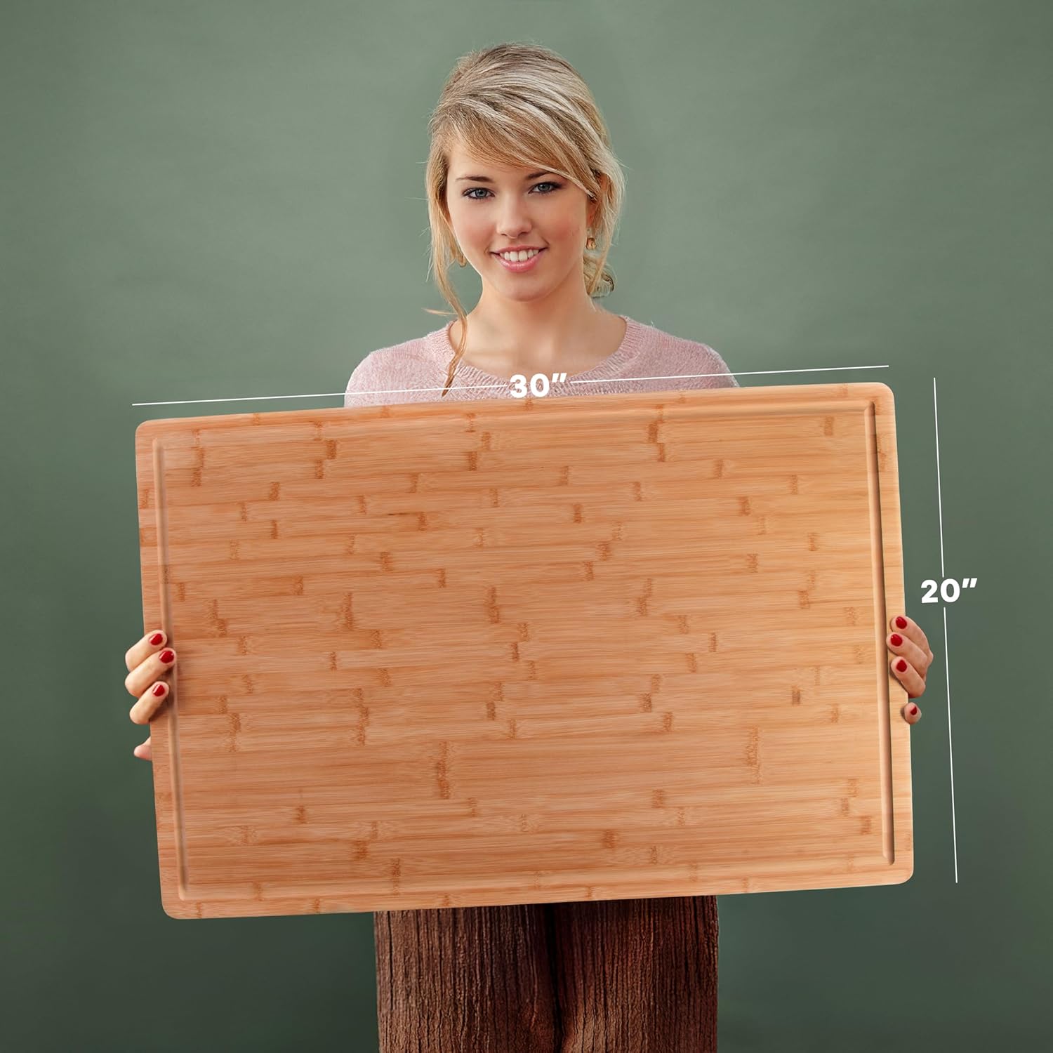 Slice, dice and keep your counters pristine – With a massive 30×20 inch size and juice grooves around the edges to catch excess liquids, this meat cutting board can handle the biggest Thanksgiving turkeys and ham while keeping your countertop clean and mess-free.