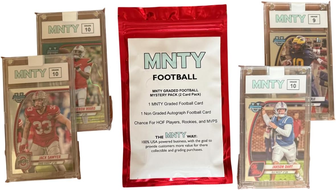 MYSTERY PACK CONTENTS: Each pack includes 2 football cards – 1 MNTY graded card and 1 non-graded autographed card