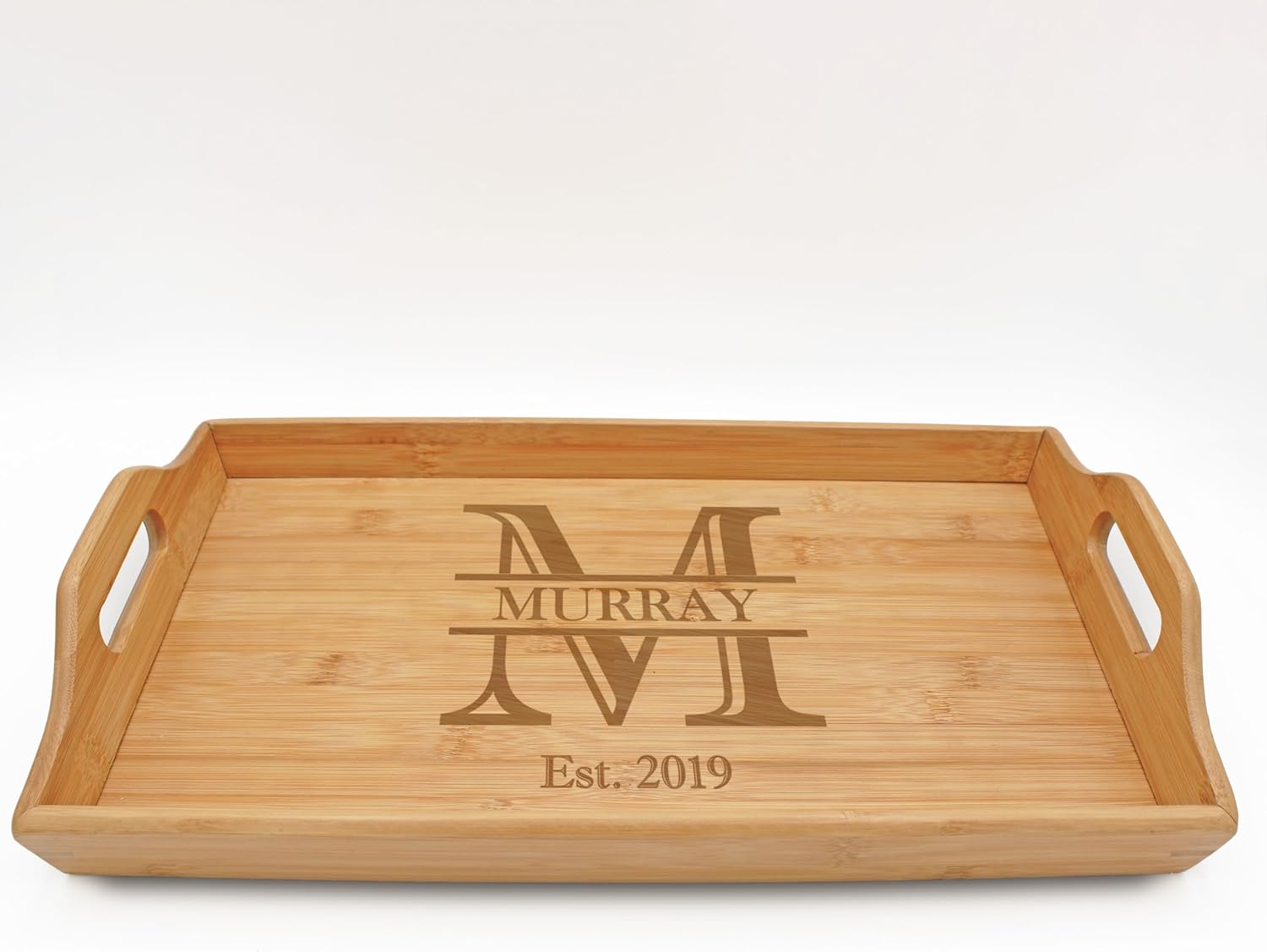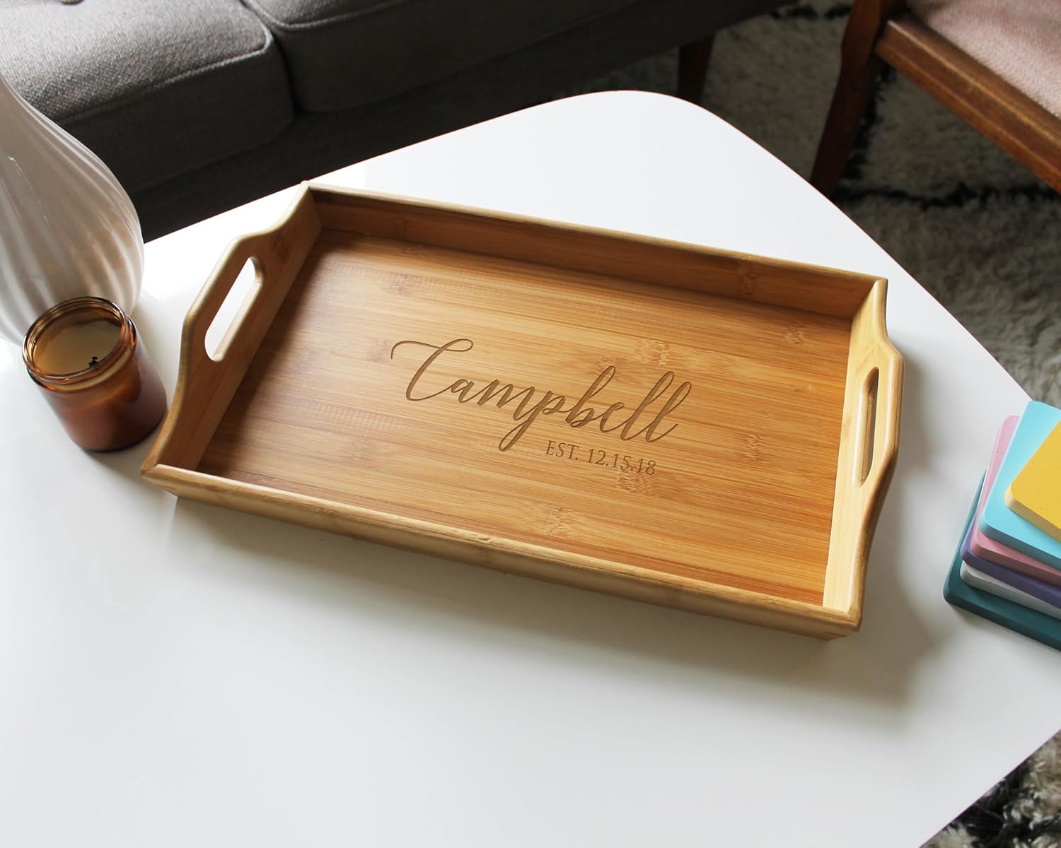 Personalized Bamboo Wood Serving Tray with Handles, Engraved Wooden Trays, Wedding Gifts, Housewarming Gifts (Dawson)