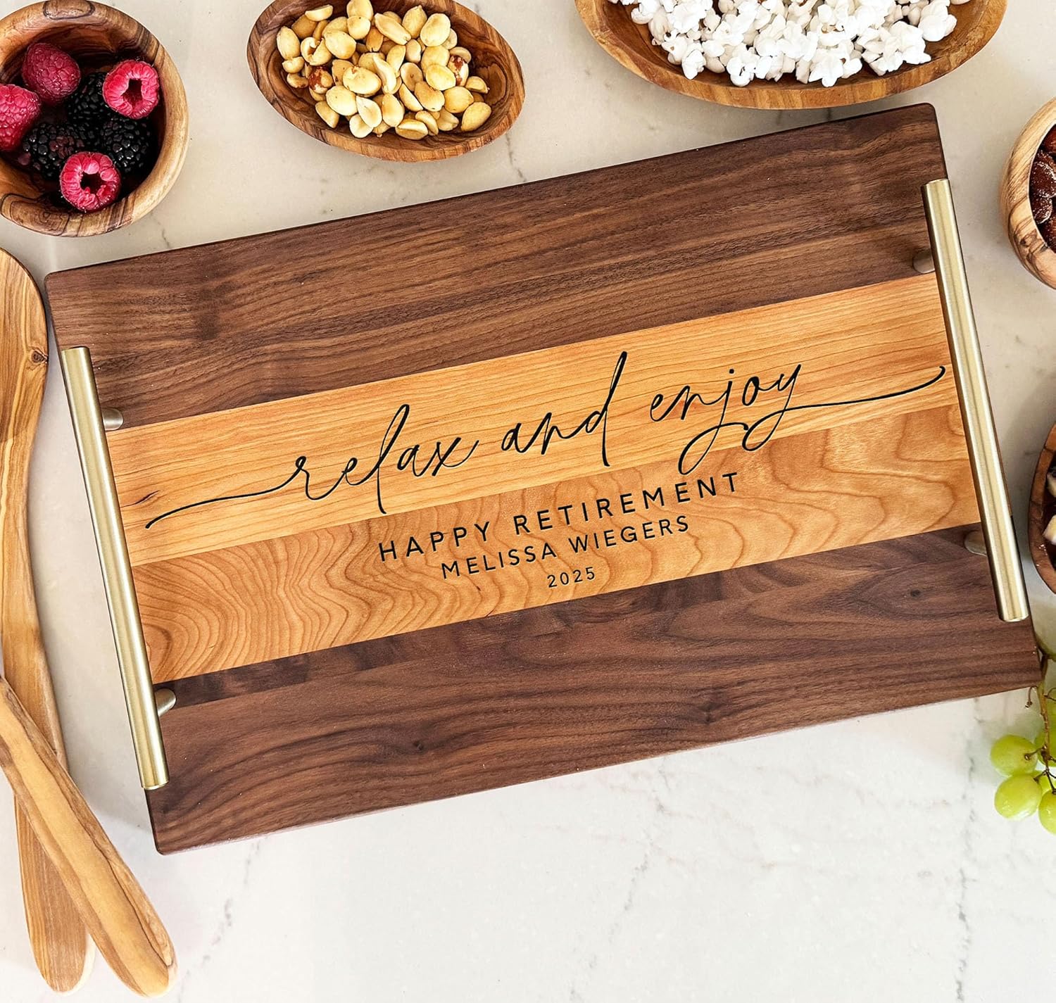 Relax and Enjoy Personalized Retirement Serving Tray | Custom Gift for Boss, Coworker, Retiree, Employee | Cherry, Maple, Walnut Wood Tray with Handles