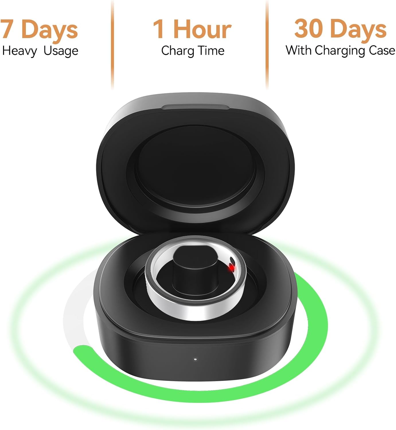 【Long Battery Life】Smart ring can use for 5-7 Days of Non-Stop Use Per Full Charge(1.5hours).Equipped with a 300mAh portable charging case, this fitness tracker ring keeps up with your pace for over 30 days total.Travel for work, go on vacation,or stay on the move
