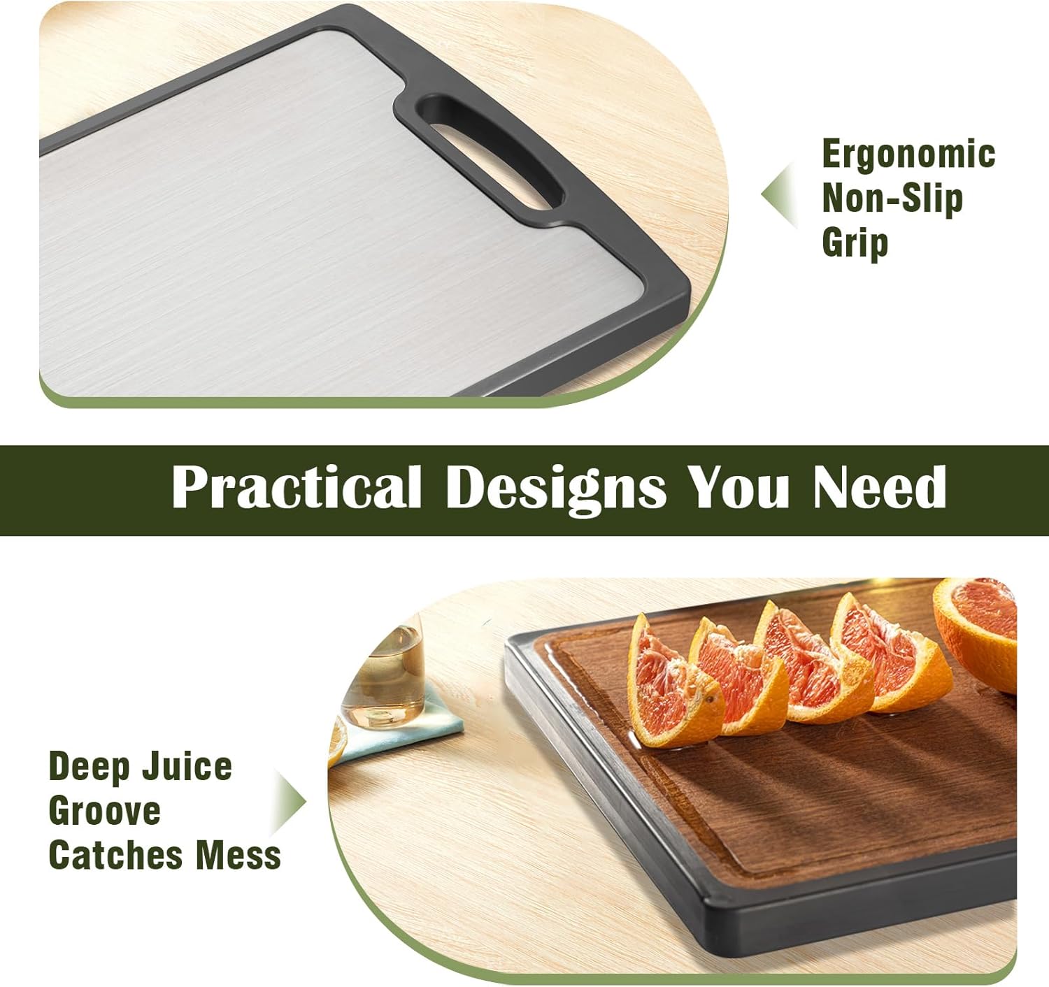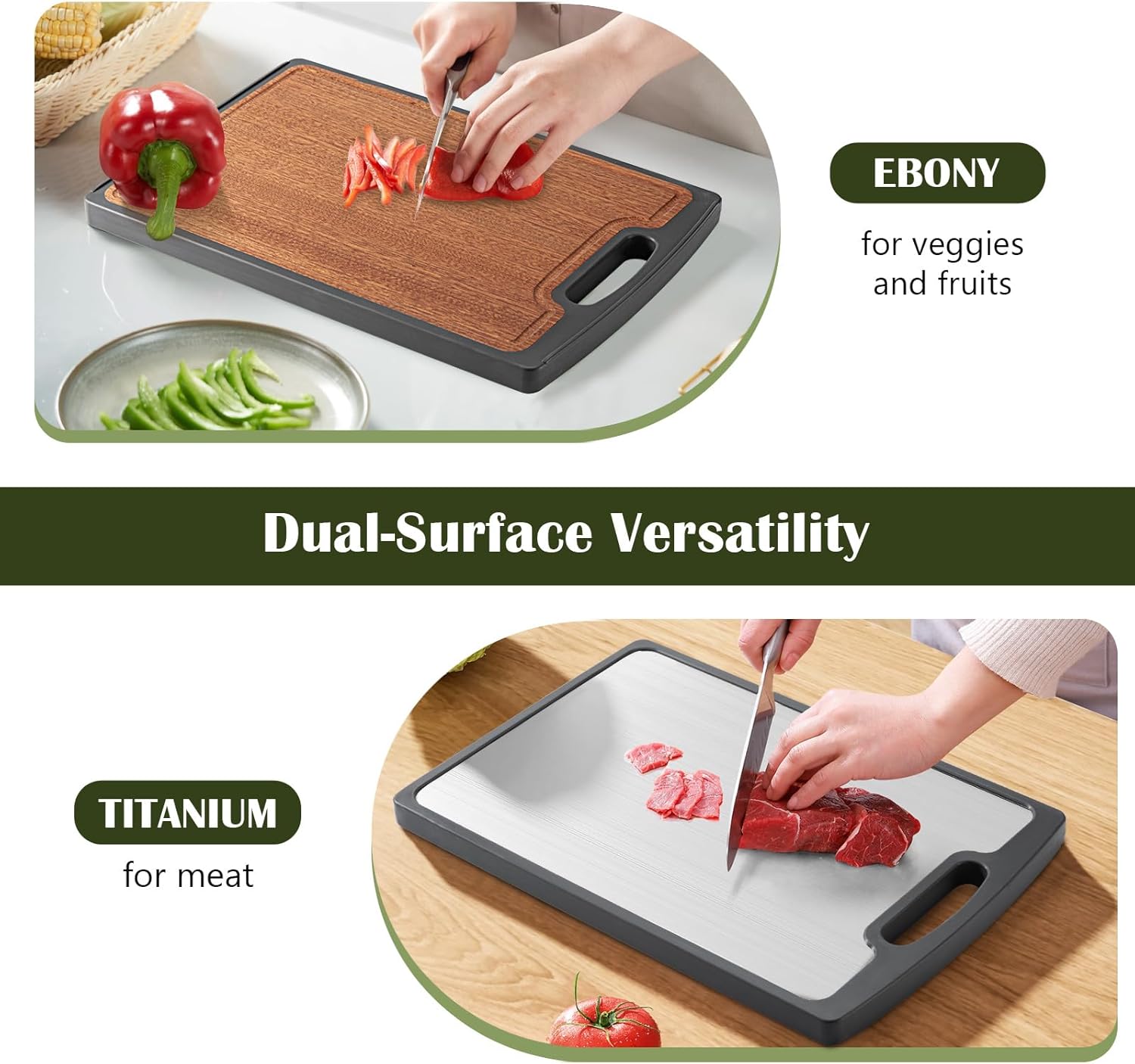 Upgraded Dual-Side Design: This large cutting boards for kitchen is made of GR1Titanium(for meat)and Natural Ebony side (veggies/fruits/bread)