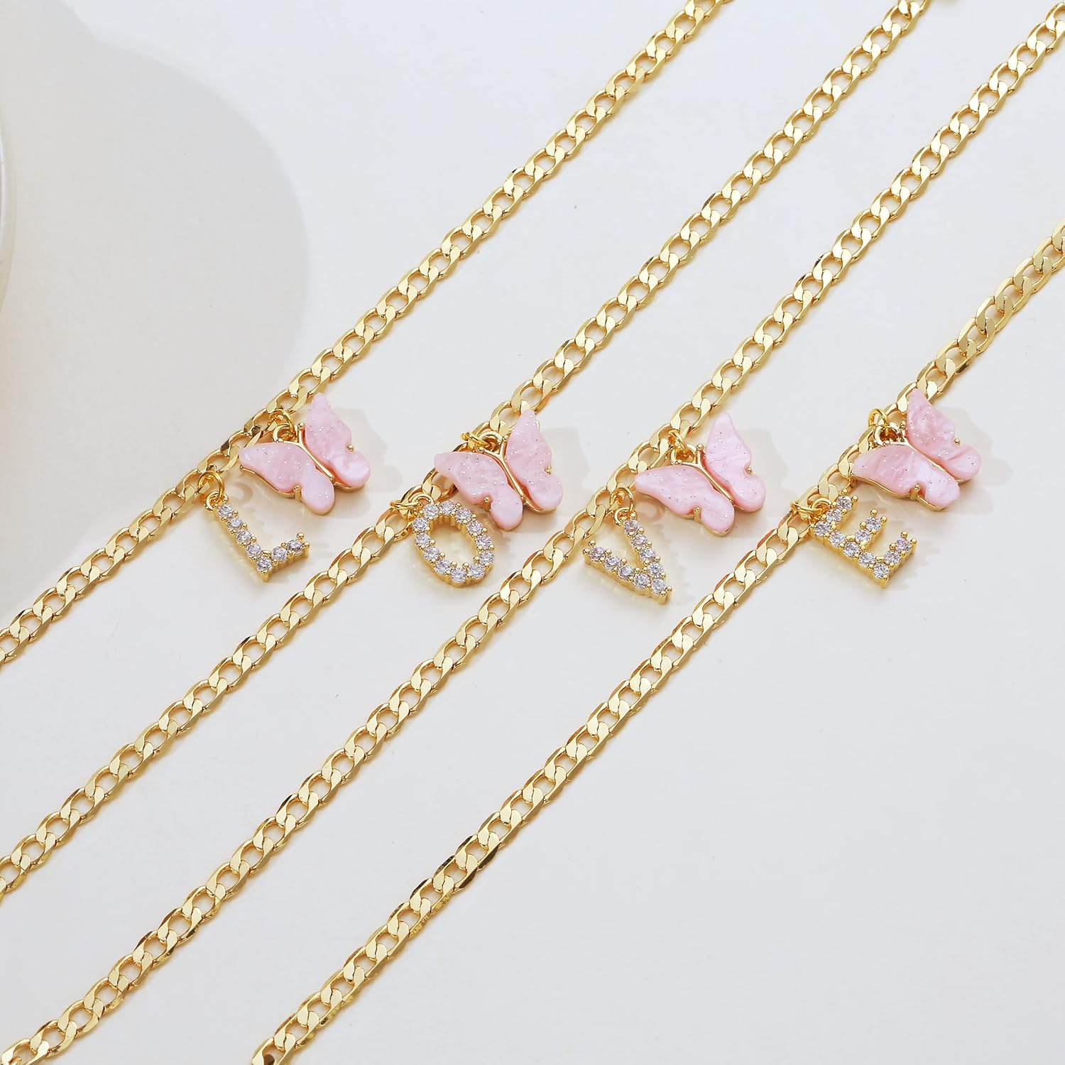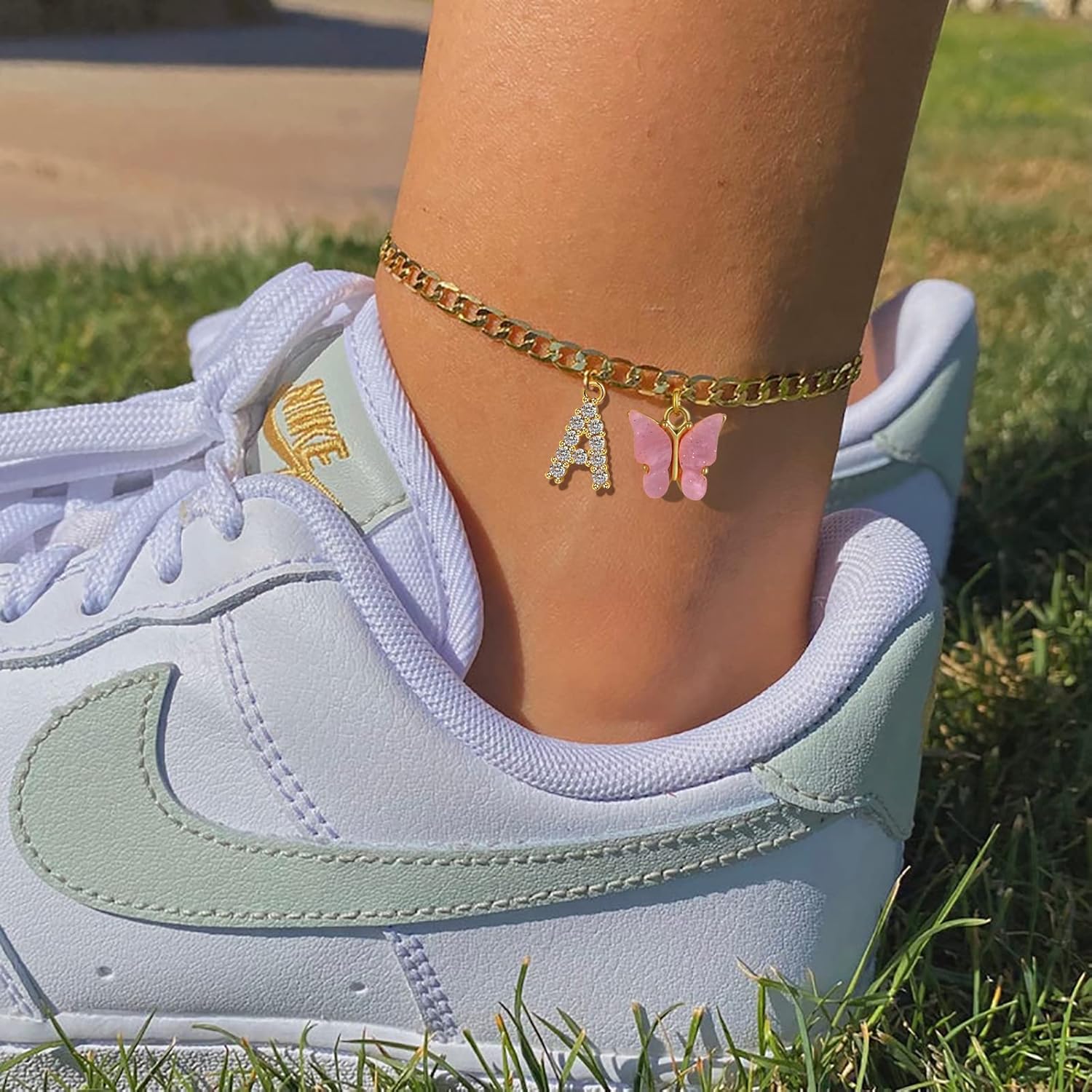 VIROMY 14K Gold Plated Dainty Butterfly Initial Ankle Bracelets Handmade Cuban Chain White Butterfly A-Z Alphabet Letter Initial Anklets Personalized Summer Beach Jewelry Gifts for Women