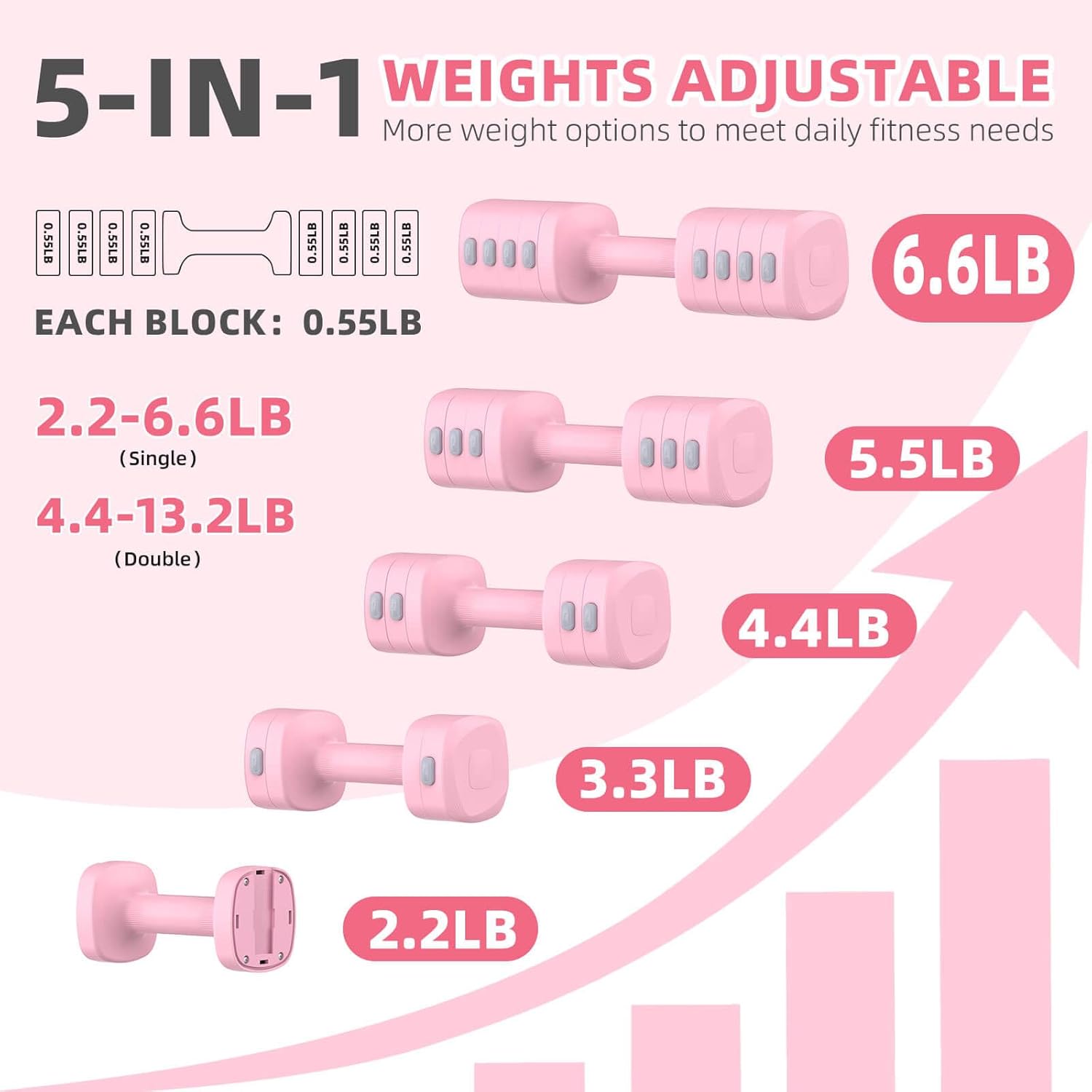 Each block weighs 0.55 lbs. A pair of dumbbell includes 16 weight blocks for versatile workouts.