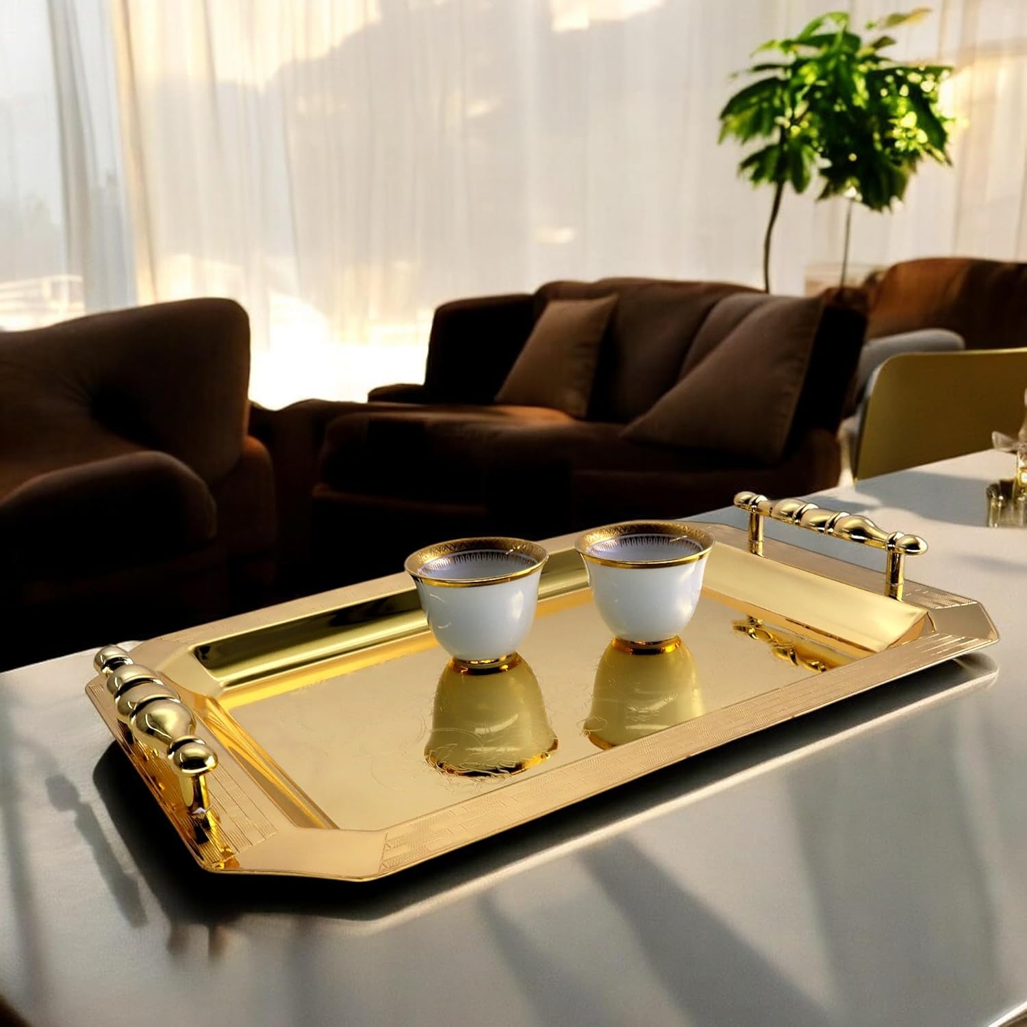 An effortlessly charming decorative piece at an affordable price. Featuring a gold-plated, high-quality iron finish with a mirrored reflection, it’s perfect for the holidays or everyday use. This multi-purpose serving tray is ideal for buffet and catering services.