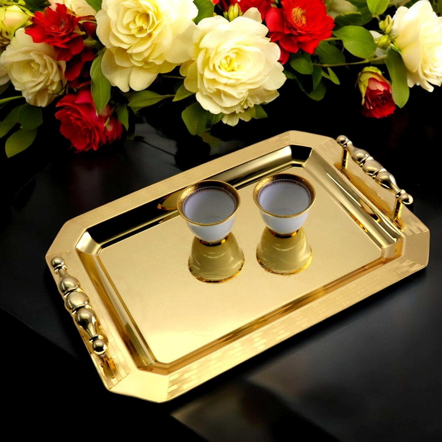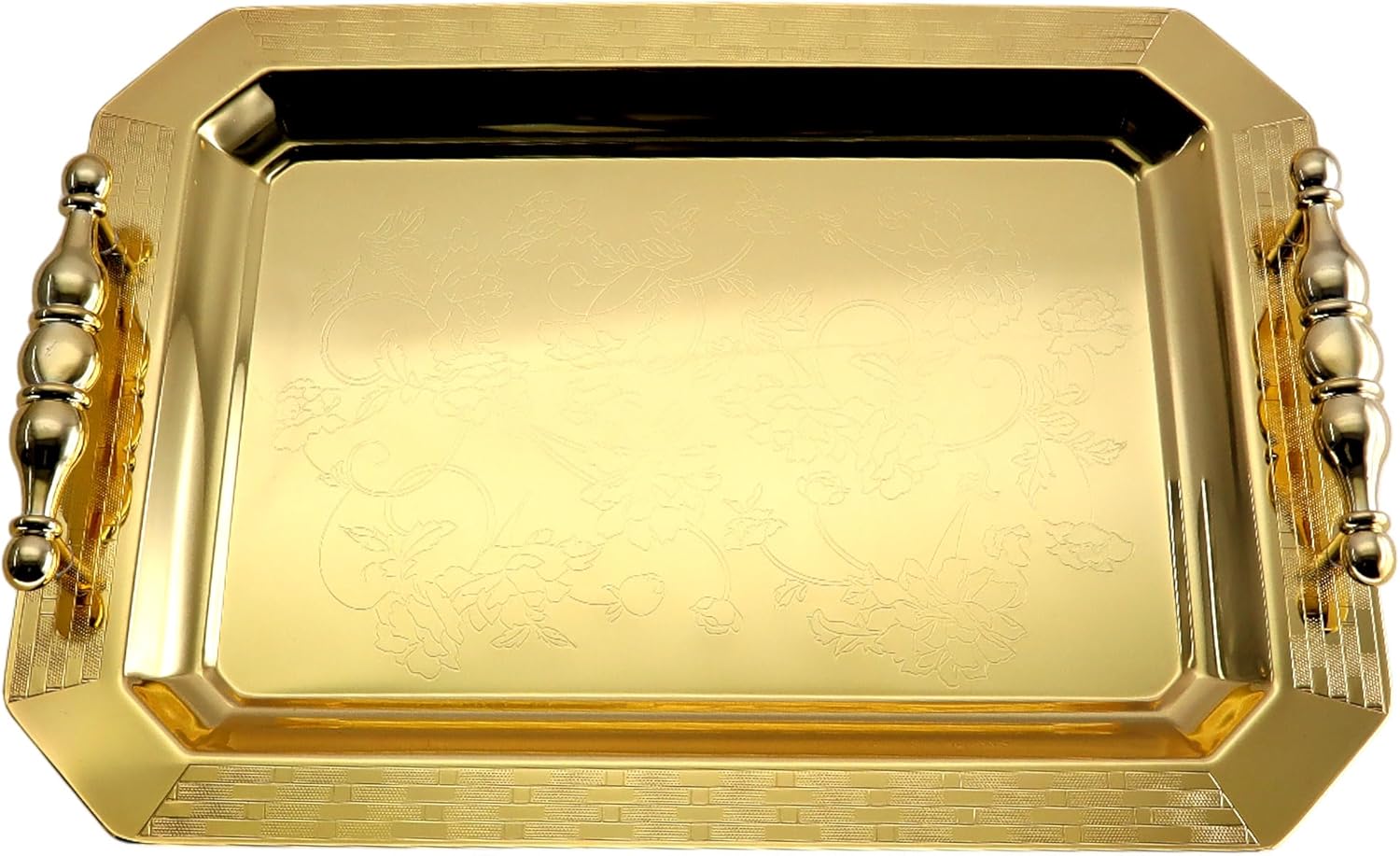 An effortlessly charming decorative piece at an affordable price. Featuring a gold-plated, high-quality iron finish with a mirrored reflection, it’s perfect for the holidays or everyday use. This multi-purpose serving tray is ideal for buffet and catering services.