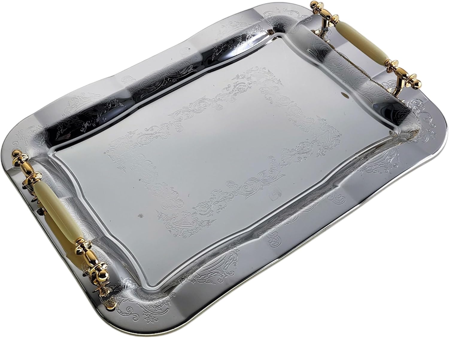 16.9 inch x 12.2 inch Oblong Chrome Plated Serving Tray with Iron Gold Handles Stylish Design Floral Engraved Edge Decorative Party Wedding Dessert Buffet Wine Platter Plate Gift NC-029
